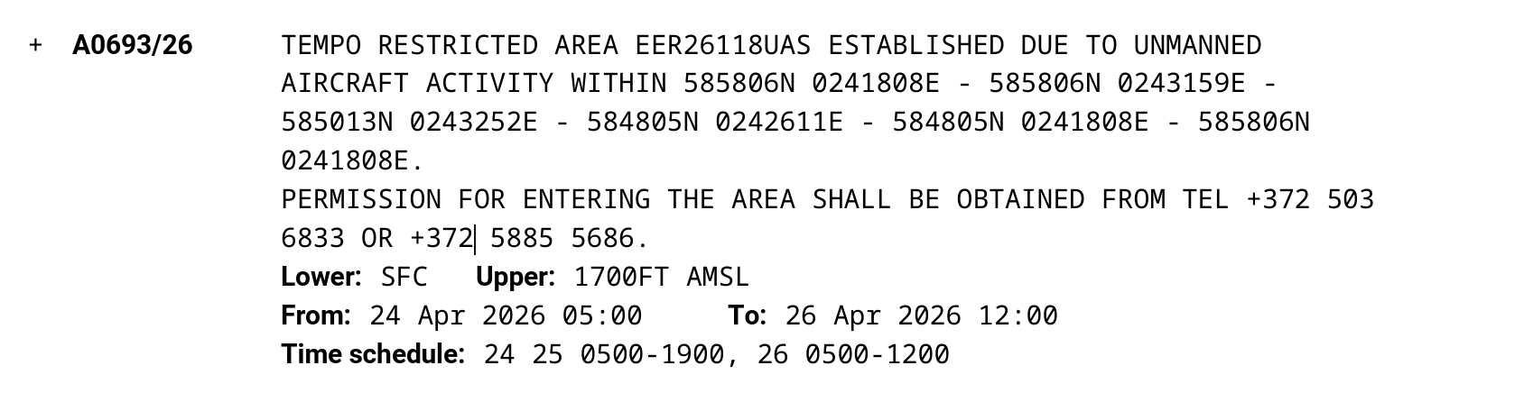 Perioodil 24-26.04 oli meil planeeritud aktiivne lennutegevus EEHM kopteri platsilt, seoses sellega, et tegevus on koordineerimata palun koheselt antud NOTAM ala tühistada.