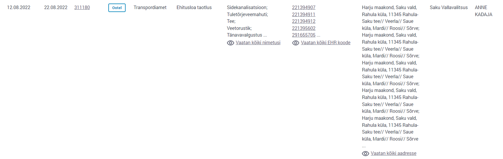 | Vastutaja | Elliko Kõiv (Transpordiamet, Users, Taristu haldamise teenistus, Projekteerimise osakond, Taristu kooskõlastuste üksus) |