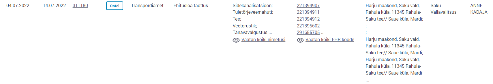 | Vastutaja | Elliko Kõiv (Transpordiamet, Users, Taristu haldamise teenistus, Projekteerimise osakond, Taristu kooskõlastuste üksus) |