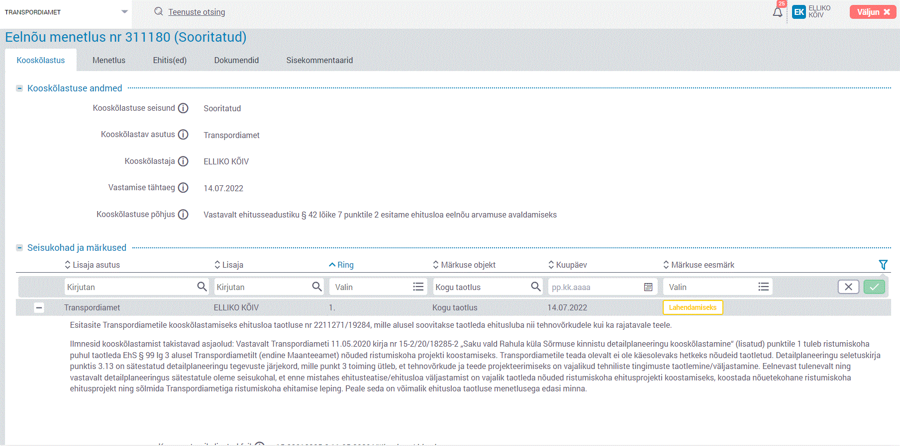 | Vastutaja | Elliko Kõiv (Transpordiamet, Users, Taristu haldamise teenistus, Projekteerimise osakond, Taristu kooskõlastuste üksus) |