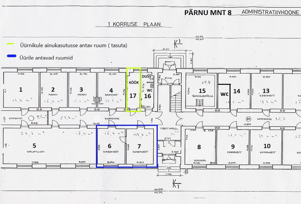 2.1. Üürileandja annab Üürnikule tasu eest kasutamiseks renoveeritud Äriruumid (edaspidi nimetatud Äriruumid) asukohaga Pärnu mnt 8, Karksi – Nuia, Karksi vald, mis koosnevad ruumist nr 6 ja 7 üldpinnaga 29,8 m2 . Lisaks üüripinnale on üürnikul vastavalt oma vajadusele õigus kasutada ruumi nr 17 (köök) üldpinnaga 6,4m2 ja ruumis olevaid seadmeid, mille eest täiendavalt üüriandjale tasu ei maksta (Vaata lepingu lisas olevat kasutusele antavate ruumide asendiplaani).