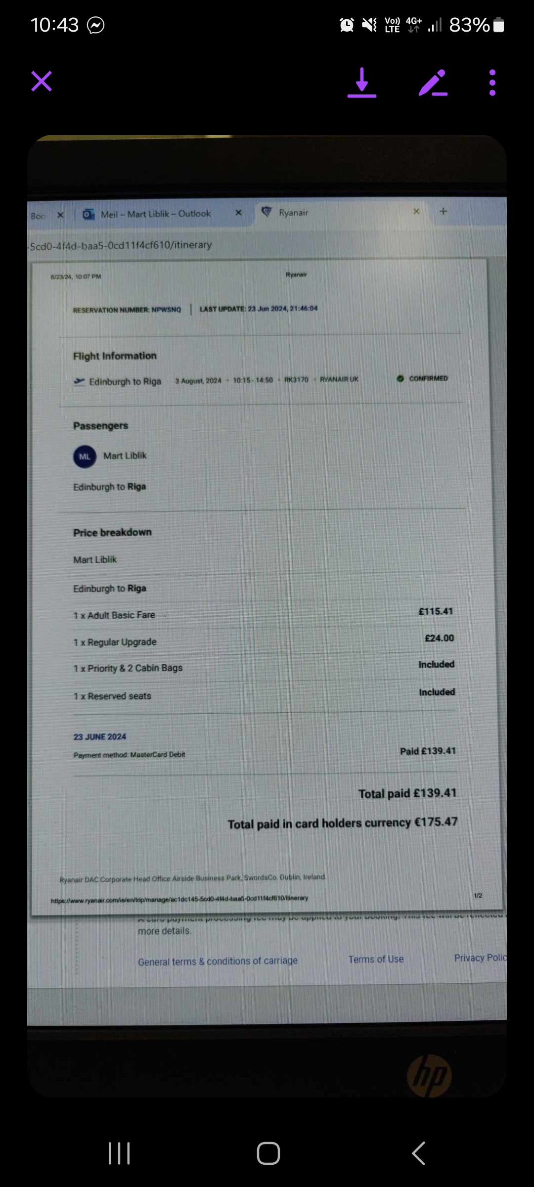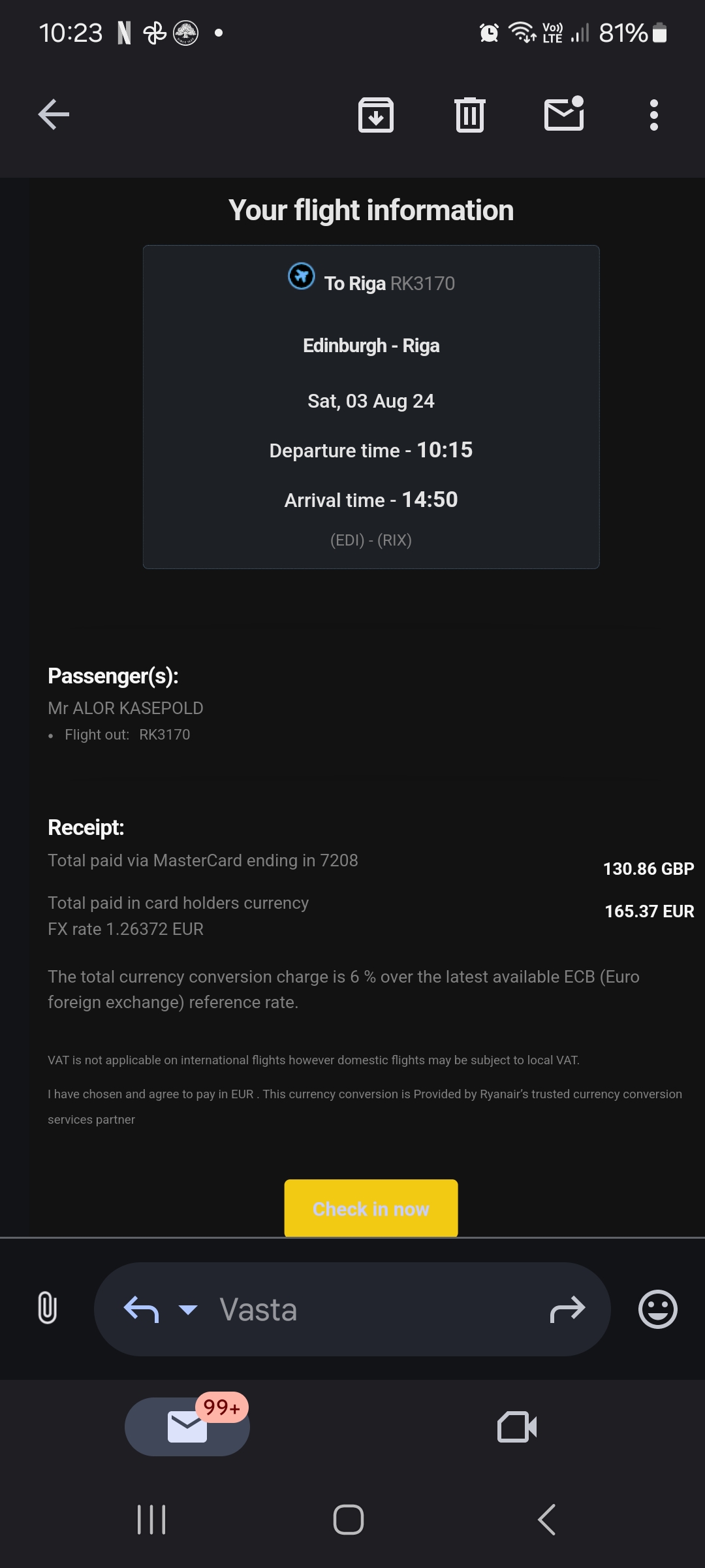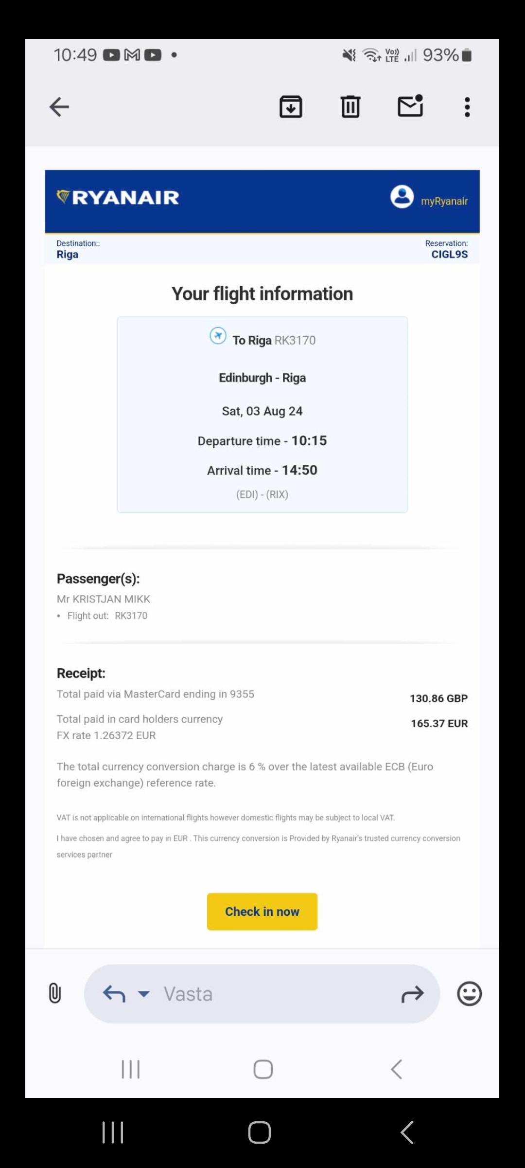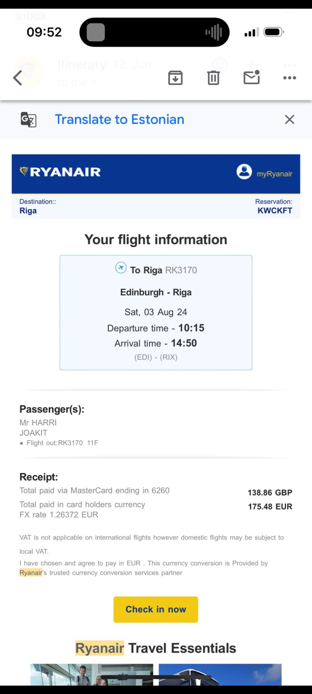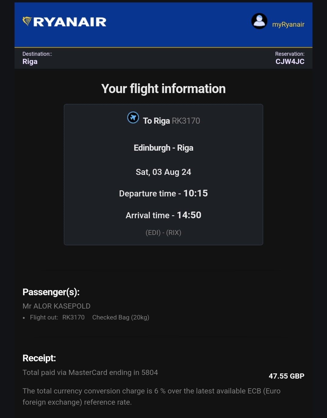 Edinburgh to Riga 3 August, 2024 10:15 - 14:50 RK3170 RYANAIR UK CONFIRMED