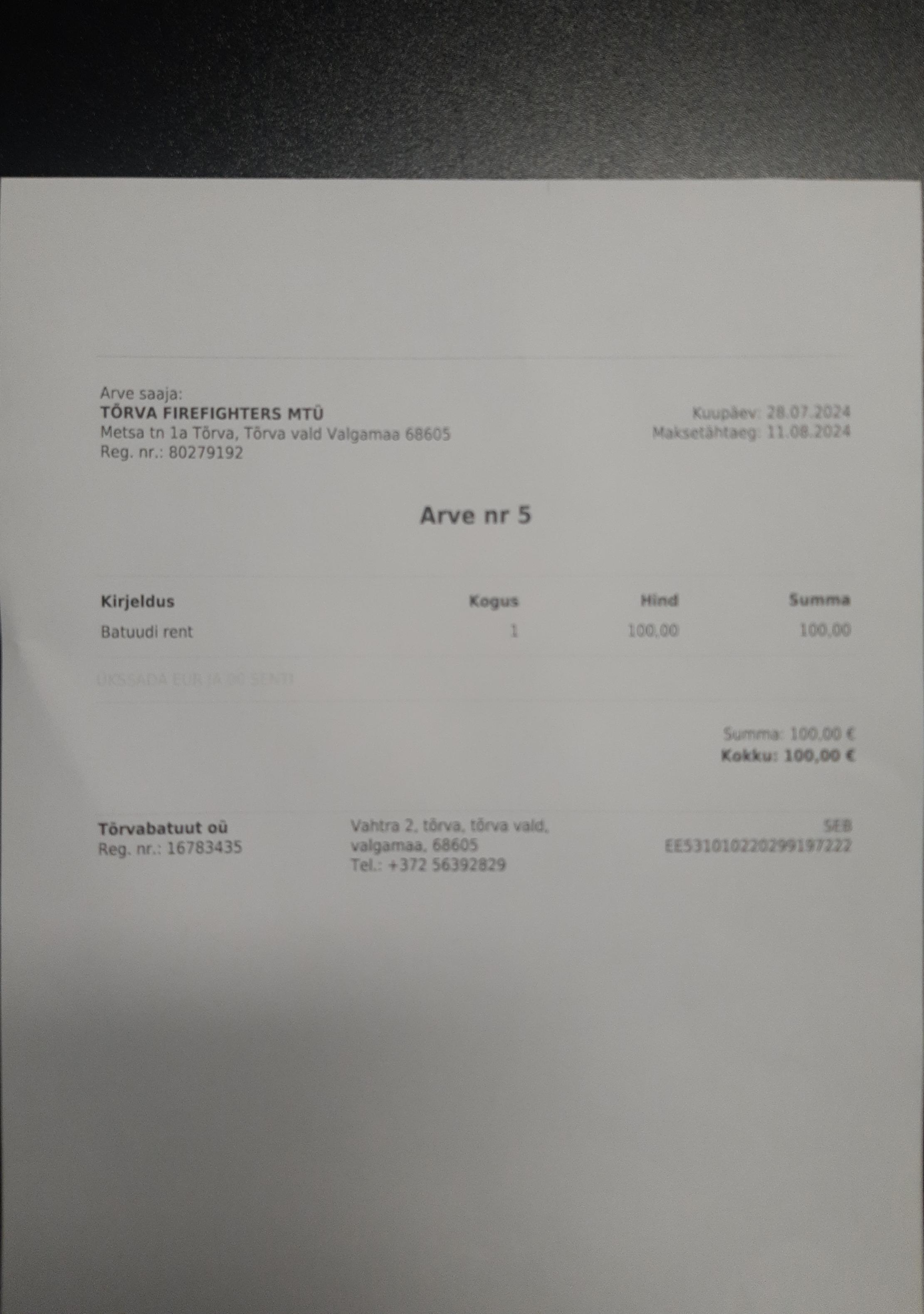 Arve saaja Mittetulundusühing Tõrva Firefighters Arve nr 24595