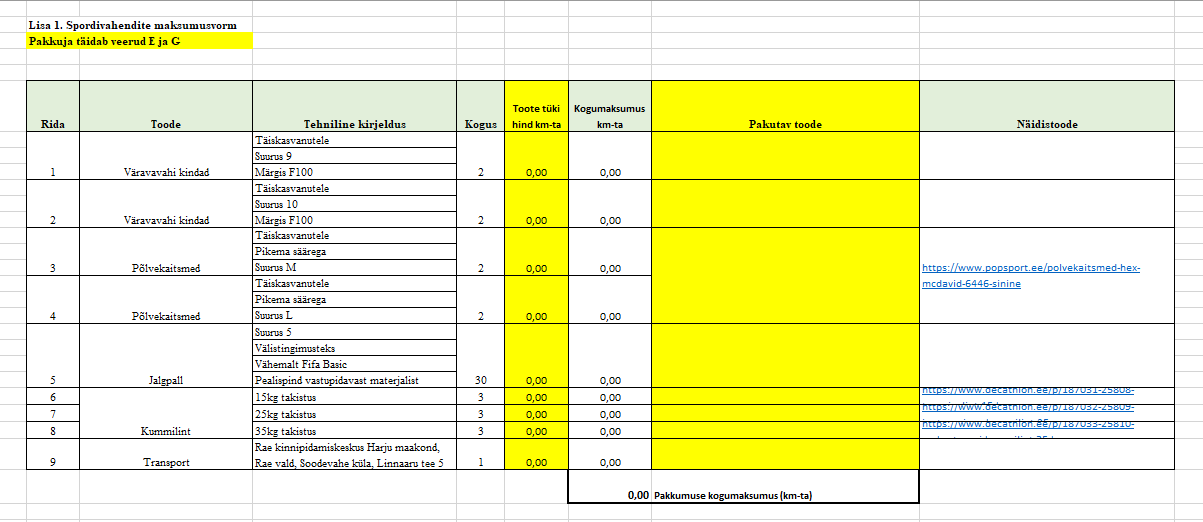 1. Täidetud maksumusvormi (Lisa.1), kus tuleb täita kollased veerud F ja H