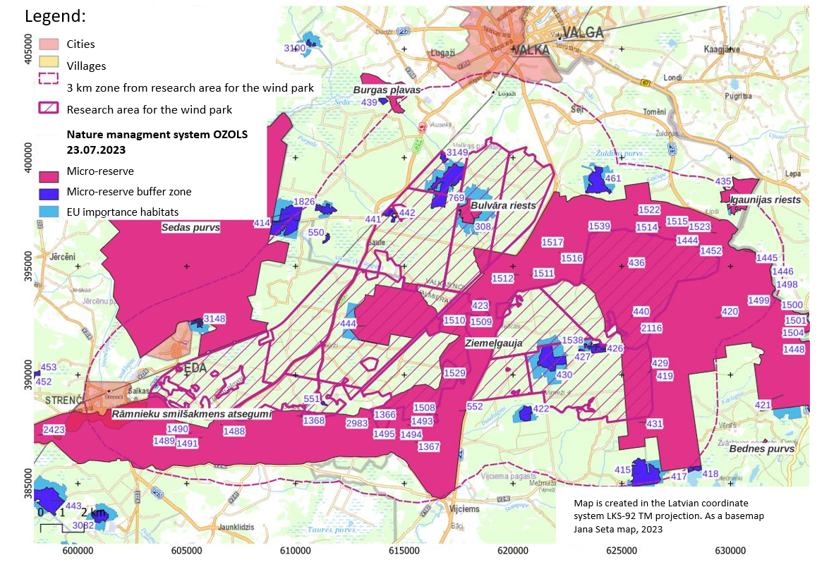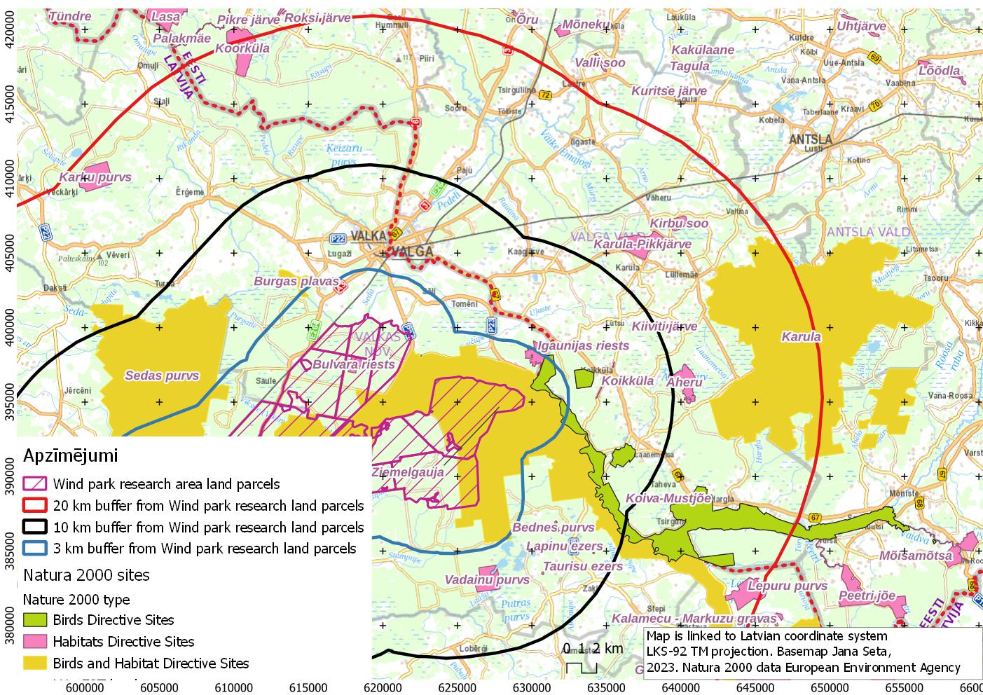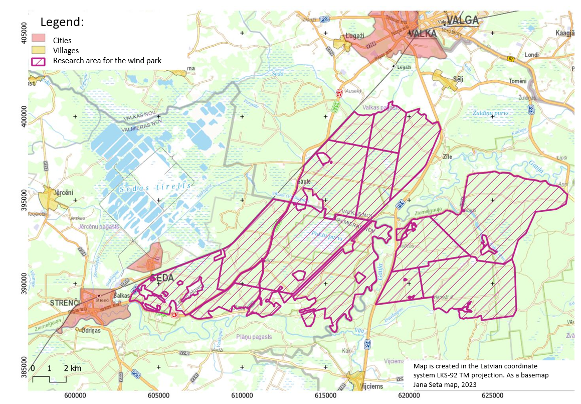 the Seda and about 5 km from Valka. The total area of the wind farm construction area is 5387