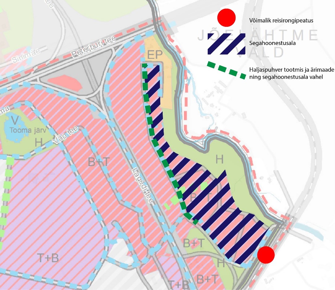 Segahoonestusalale võib kavandada lisaks elamutele ka ärihooned ligikaudu 30% ulatuses, (antud esialgse indikatsioonina), sh kauplused, teenused, toitlustus, aga ka kontoripinnad. Lisaks näha ette eraldi ühiskondlike hoonete kinnistud koolide, lasteaedade ja kogukonna hoonete tarvis. Tihedamat hoonestust, äripindasid ja ühiskondlike hooneid tuleks kavandada ühistranspordi peatuste juurde (nt. võimaliku tulevase raudteejaama juurde). Ettevõtlusala, laondus- ja tootmisala kõrvalotstarbega (B+T) alade ja segahoonestusalade vahele tuleb kavandada haljastatud puhverala laiusega vähemalt 25 m. Tallinna Linnaplaneerimise Amet on küsinud kinnistuomanike seisukohta hiljemalt 07.08.2023 Lasnamäe tööstusalade üldplaneeringus oleva juhtotstarbe muutmiseks segahoonestusalaks. Piirkonda elamute sobivuse kaalumiseks koostab Tallinna Keskkonna- ja Kommunaalamet keskkonnamõju hindamise vajalikkuse eelhinnangu.