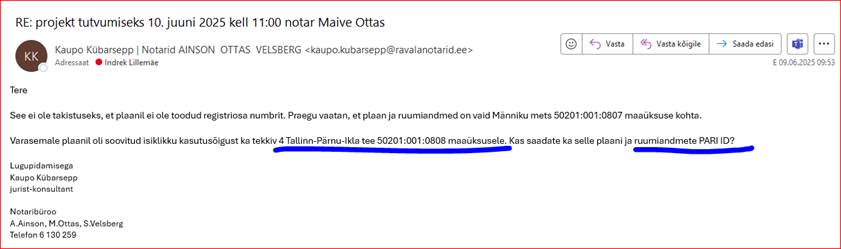 Asjaõiguslepingut ei saa sõlmida ja omandit üle võtta, enne kui on lõige välja mõõdetud nii, et omanikul on kõik õigused oma kinnistule ja võib sõlmida lepinguid, aga kuna kinnistusraamatus on märge meile tuleva tüki kohta, siis IKÕ lepingu juurde on vaja TRAMi nõusolekut. Kui omanikuga IKÕ lepingu aega kokku leppida, siis ka mulle sellest teada anda ning vajadusel saan osaleda lepingul ning anda selleks nõusoleku.