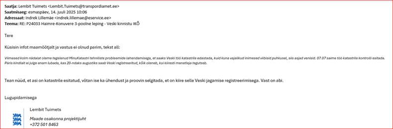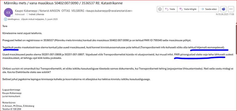 Olen teinud viimase päringu katastrile 15.08. Sellele ei ole vastus saanud. Tegi just uue päringu katastritöötajale, Urve Kenk, kes selle maatoiminguga nr 2025070314884 tegeleb.