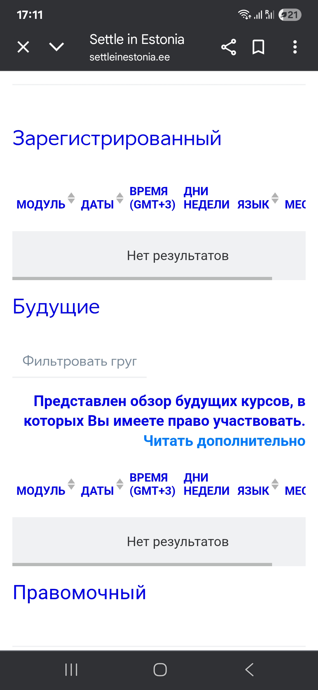 Информацию о начале регистрации на новые языковые курсы мы сообщим во второй половине сентября. Ожидаем открытия регистрации ориентировочно в середине октября. Пожалуйста, следите за обновлениями о новых курсах на странице Settle in Estonia в Facebook: www.facebook.com/settleinestonia.