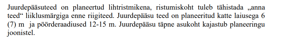 6. Detailplaneeringuga ei saa anda ristumiskohtade parameetreid nii täpselt, nagu seletuskirjas on toodud. Piisab kui on toodud, et ristumiskohad kavandatakse lihtristmikuna, mille parameetrid täpsustuvad edasise projekteerimise käigus. Hiljem võib tekkida mõttetu vaidlus, kui asjaolud täpsustuvad.8.