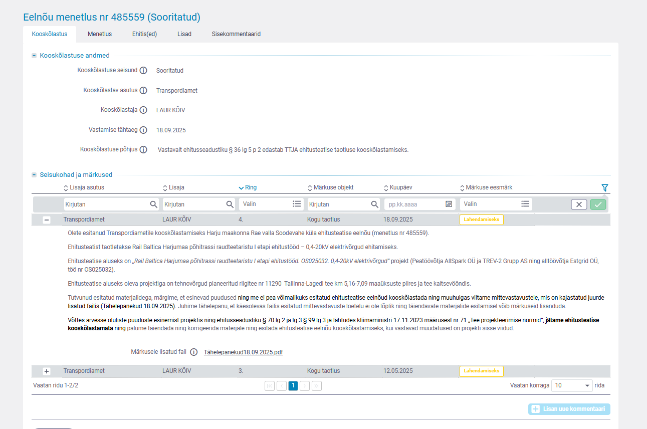 EHR- Harju maakond, Rae vald, Soodevahe küla, 11290 Tallinn-Lagedi teel Rail Baltica trassi elektrivõrgu ehitusteatis, menetlus nr 485559 | 09.10.2025 | 1 | 7.1-2/25/6668-5 | Sissetulev kiri | transpordiamet | Tarbijakaitse ja Tehnilise Järelevalve Amet |