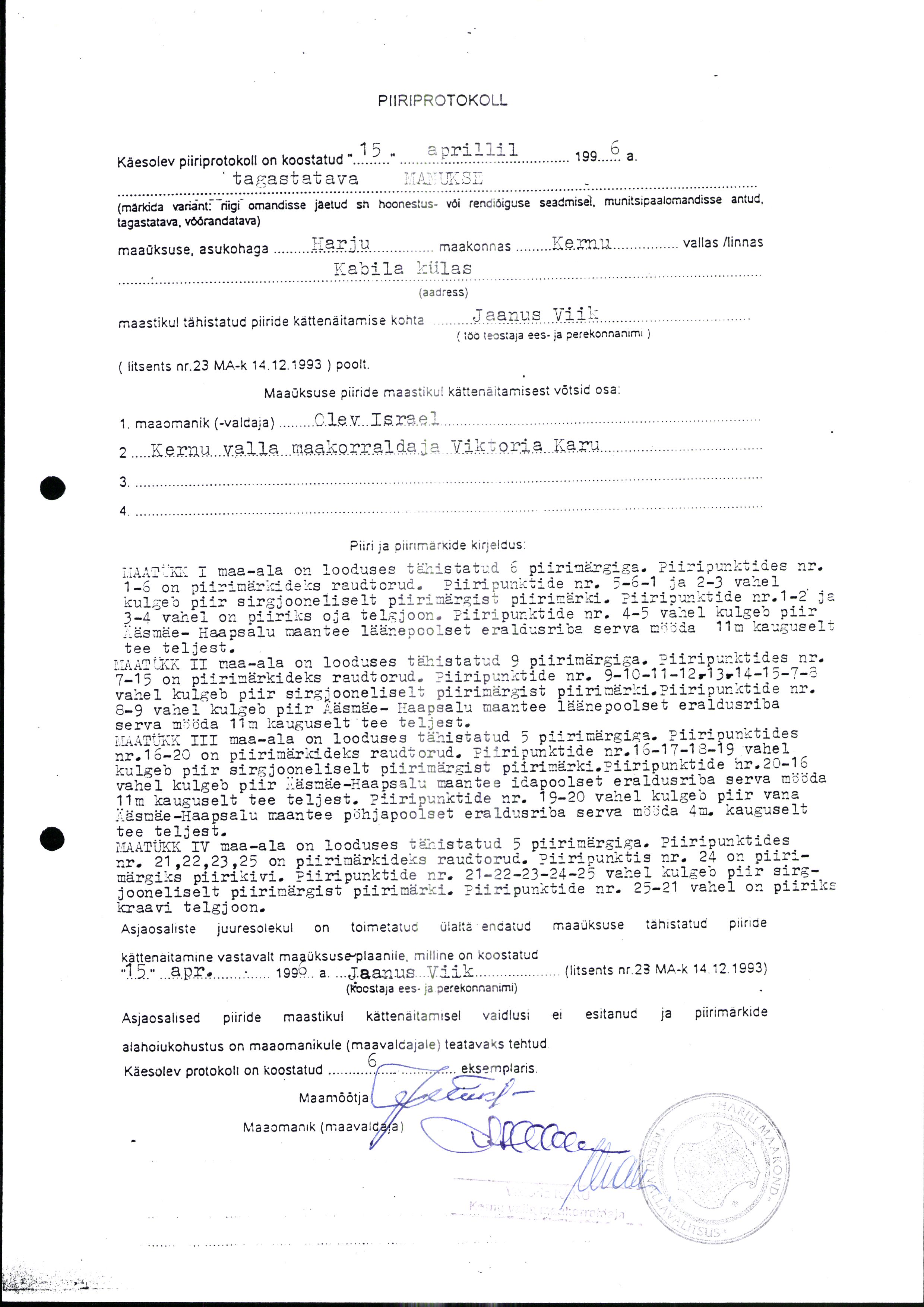 Transpordiamet 9 Ääsmäe-Haapsalu-Rohuküla tee (72704:001:0032) katastriüksuse omanik Piiri asukoha maastikul kättenäitamise põhjus Teatan Harju maakonnas Saue vallas Kabila külas asuva Eesti Vabariigile kuuluva nimetatud katastriüksusega piirnevate Vahtra (72601:001:1023) ja Manukse põld (29701:005:0283) katastriüksuste piiride muutmisest ja mõõdistamisest. Ühisel mõõdistatud piiril on 1 ühine piiripunkti nr 16 , vt Lisa 1. Looduses hävinud piirimärk taastati endise Manukse põld katastriüksuse piiriprotokolli andmete alusel, 11 m kaugusele 9 Ääsmäe-Haapsalu-Rohuküla tee teljest ja 4 m kaugusele Vana-Haapsalu maantee L1 teljest. Maantee poolne piir jääb kulgema mööda teemaa serva 11 m kaugusel tee teljest, antud lõigus on tee sirge. Aeg ja koht Piiri ja piirimärkide kättenäitamine toimub nimetatud katastriüksustel looduses. Kutsun Teid piiri ja piirimärkide kättenäitamisele esmaspäeval 29.09.2025 kell 9.00. Kohtumispaigaks on piiripunkt nr 16, vt Lisa 1. Ilmumata jätmise või kirjaliku seisukoha esitamata jätmise tagajärjed Oma osalemisest või mitteosalemisest palun teavitage mind sellest kirja lõpus oleva e-maili või telefoni teel. Samadel kontaktidel saate esitada ka täiendavaid küsimusi. Piiri kättenäitamisele võite saata ka esindaja. Palun mind sellest eelnevalt teavitada ja esitada mulle esindust tõendav volikiri. Kutse saatmisega loetakse piirimärkide asukohad ja nende alalhoiu kohustus kinnisasja omanikule teatavaks tehtuks ja omanik piiride asukohaga nõustunuks (maakatastriseaduse § 17 lõige 6), välja arvatud juhul, kui ilmneb piiride kindlakstegemise vajadus. Kui Teil on piiri ja piirimärkide kohta märkusi, tuleb need esitada hiljemalt piiri kättenäitamisel maastikul. Teie poolt esitatud märkused, taotlused ja seisukohad kantakse piiriprotokolli. Palun kindlasti mind teavitada, kas osalete või mitte, ilma eelneva teavitamiseta piiri ja piirmärkide kättenäitamist ei toimu ning loen piirid ja piirimärgid kätte näidatuks ilma märkusteta. Piiriprotokolli allkirjastamine Pärast piiri kättenäitamist koostatakse 3 tööpäeva jooksul piiriprotokoll, mida saate allkirjastada digitaalselt. Digitaalse allkirjastamise võimaluse puudumisel teavitage mind eelnevalt ning sellisel juhul saate piiriprotokolli allkirjastada käsitsi paberil. Piirimärkide alalhoiukohustus Kinnisasja omanik peab tagama piirimärgistuse säilimise. Te ei või piirimärke iseseisvalt muuta ega ümber paigutada (asjaõigusseaduse § 128 lg 2). Lugupidamisega