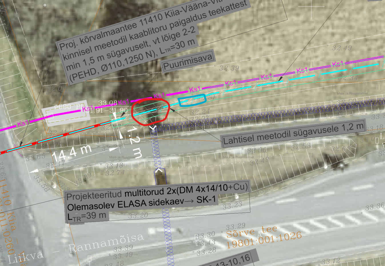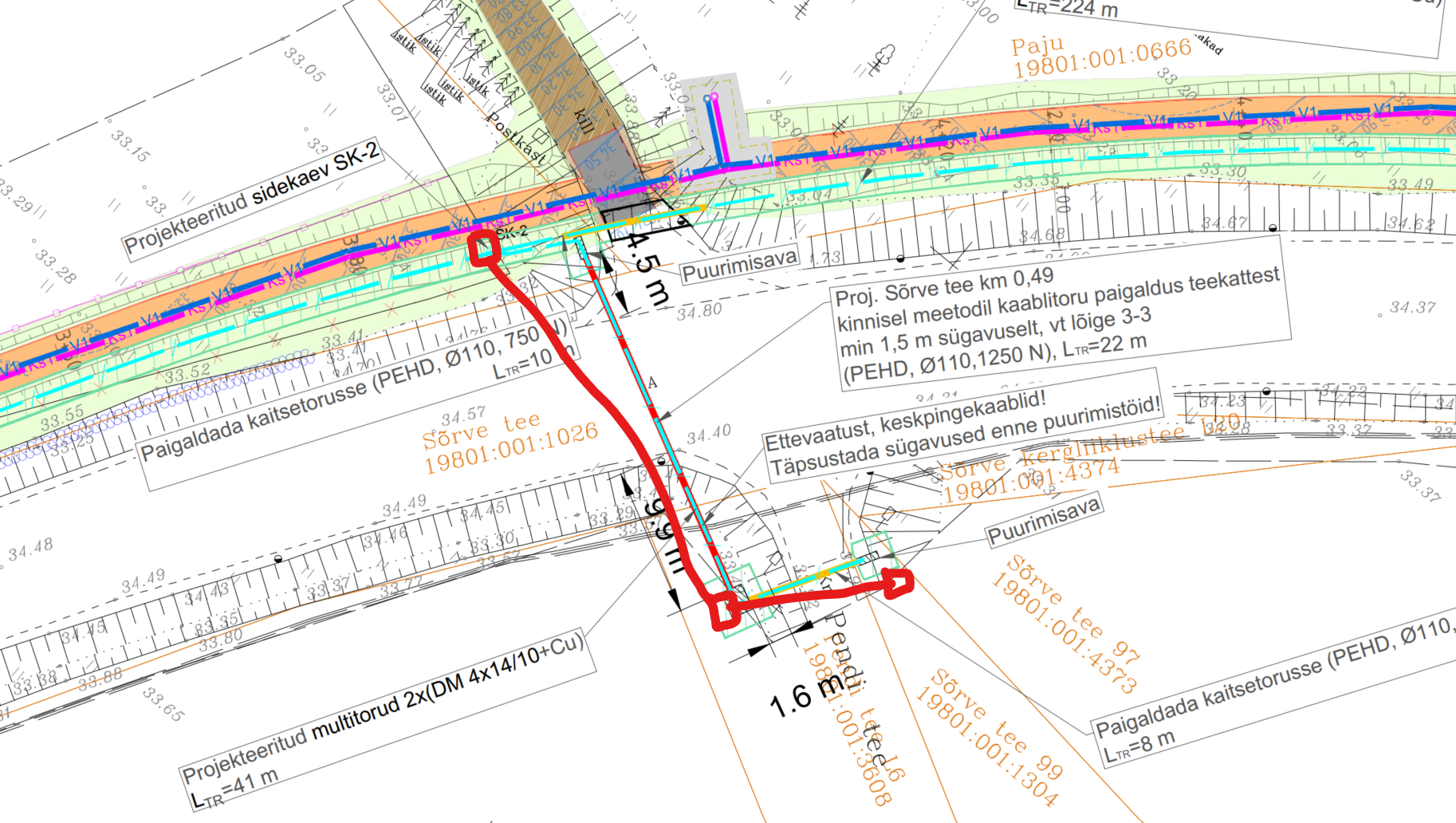 Palume nihutada antud puurimiskaevikud eemale mahasõidust (punane kontuur). Samuti vb on mõistlikum nihutada ka sidekaev mahasõidu muldest eemale nt 1m kaugusele.