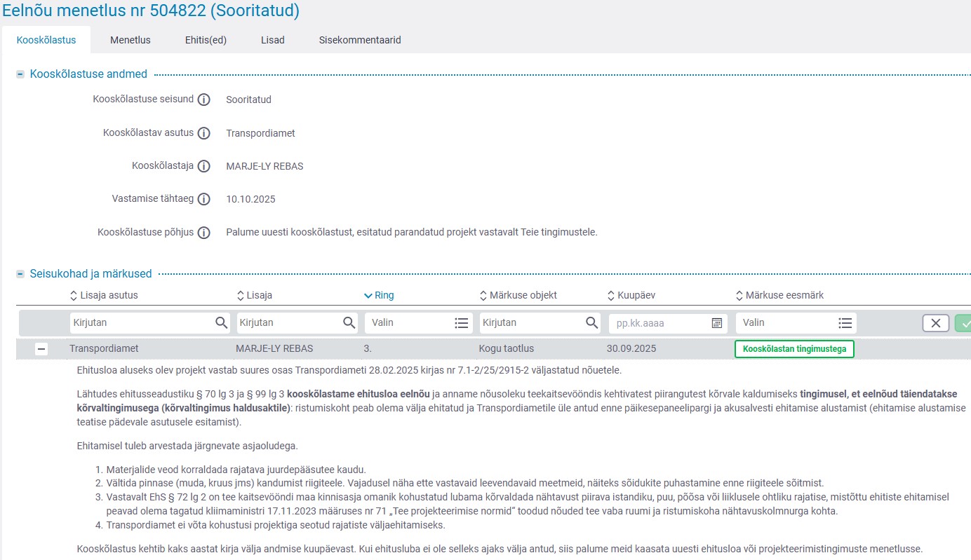 Palun avage eelnõu e-ehituse keskkonnas (menetlus nr: 504822), määrake omalt poolt kooskõlastuse eest vastutav kasutaja ja kontrollige eelnõu andmeid.