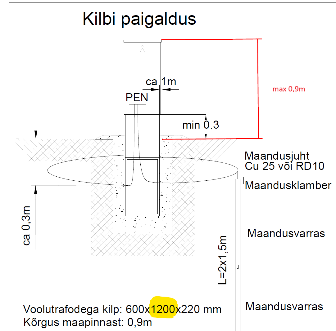 Kilbi paigaldusjoonisele lisatud mõõtude seletused ning punasega kõrgus maapinnast.
