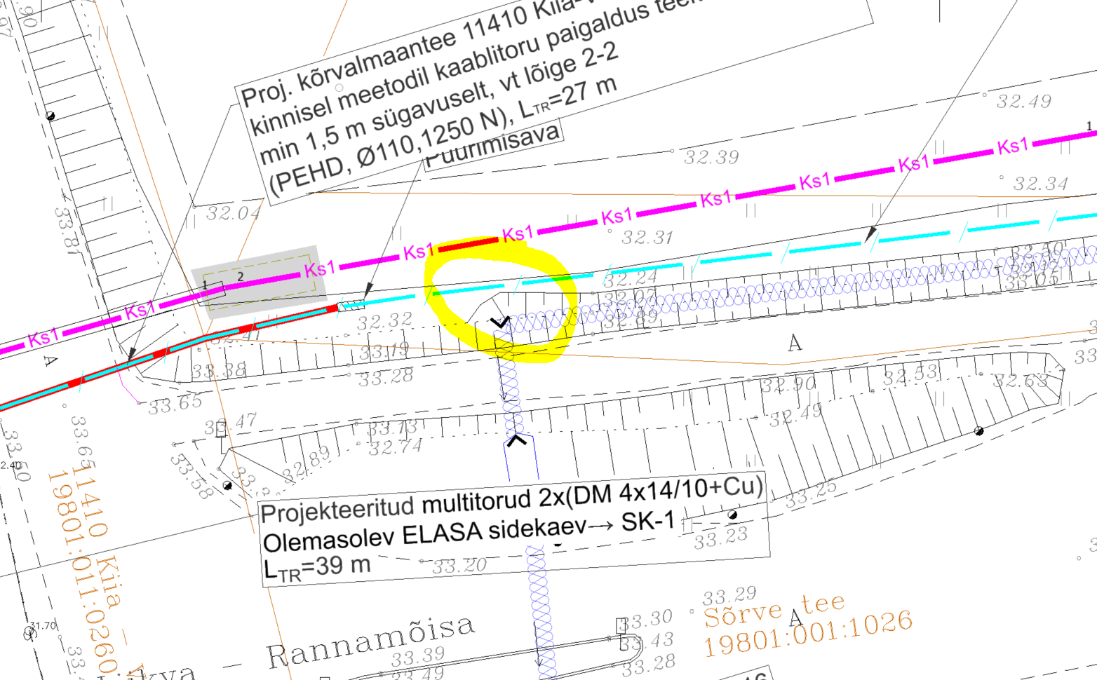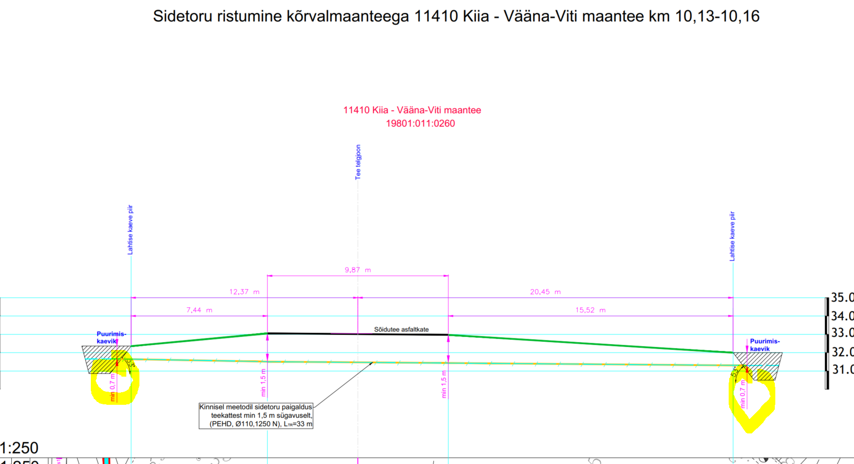 1. Sidetoruga sõidutee alt läbiminek teostada kinnisel meetodil läbipuurumise teel PEHD kaablikaitsetorudes Ø110 (1250 N). Lähtuda Transpordiameti normidest.