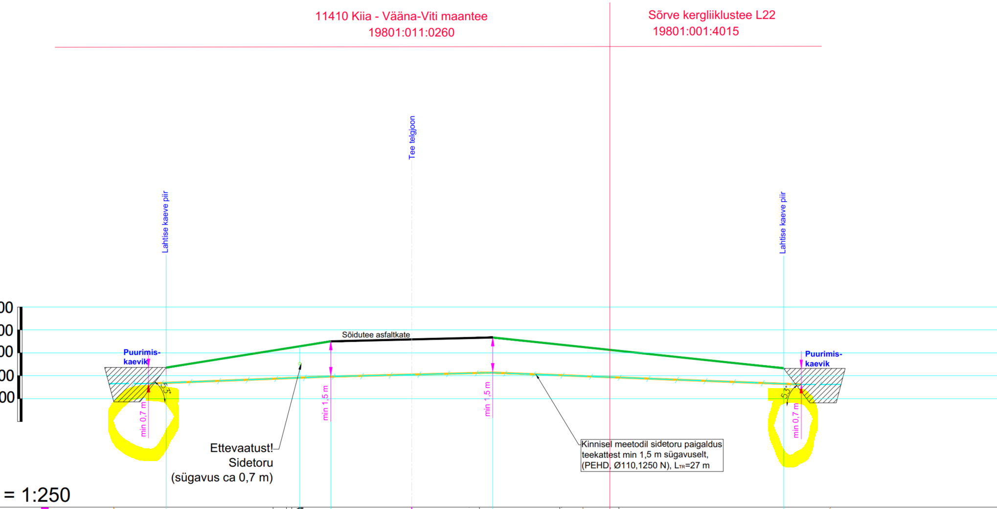 Asendiplaani joonistel tuua vähemalt riigitee maaüksuse ulatuses välja tehnovõrgu paigaldustehnoloogia (lahtine või kinnine meetod), sügavus ning kaitsetoru nõuded iga trassi lõigu kohta (nn noolega kastis sh ka avatud meetodi osas).