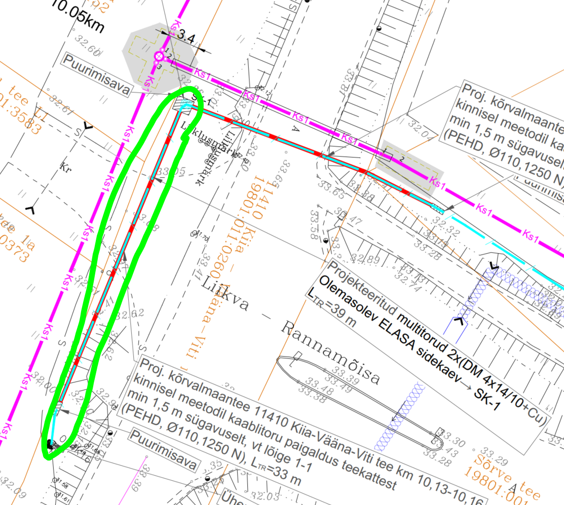 Palume nihutada antud puurimiskaevikud eemale mahasõidust (punane kontuur). Samuti vb on mõistlikum nihutada ka sidekaev mahasõidu muldest eemale nt 1m kaugusele.