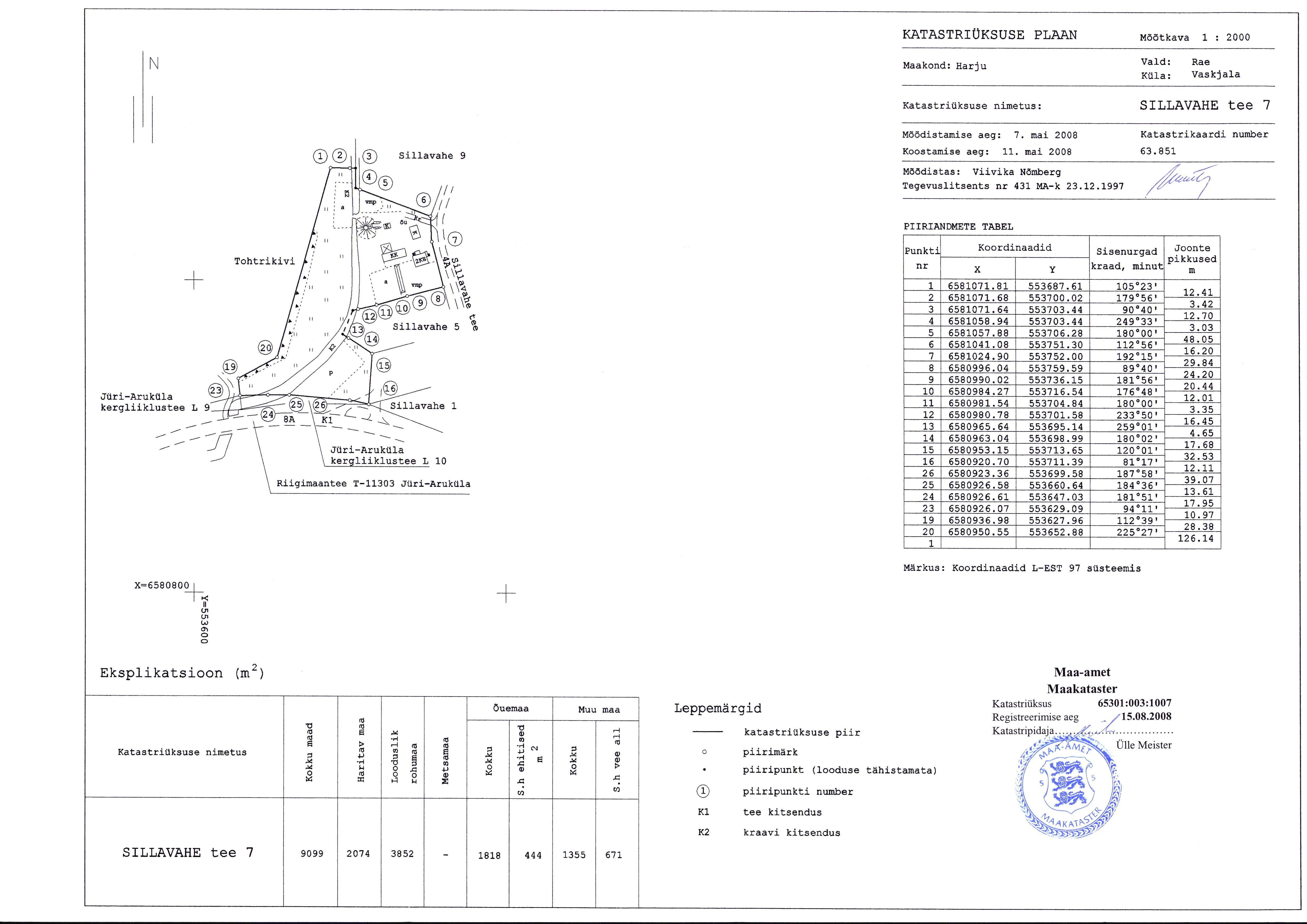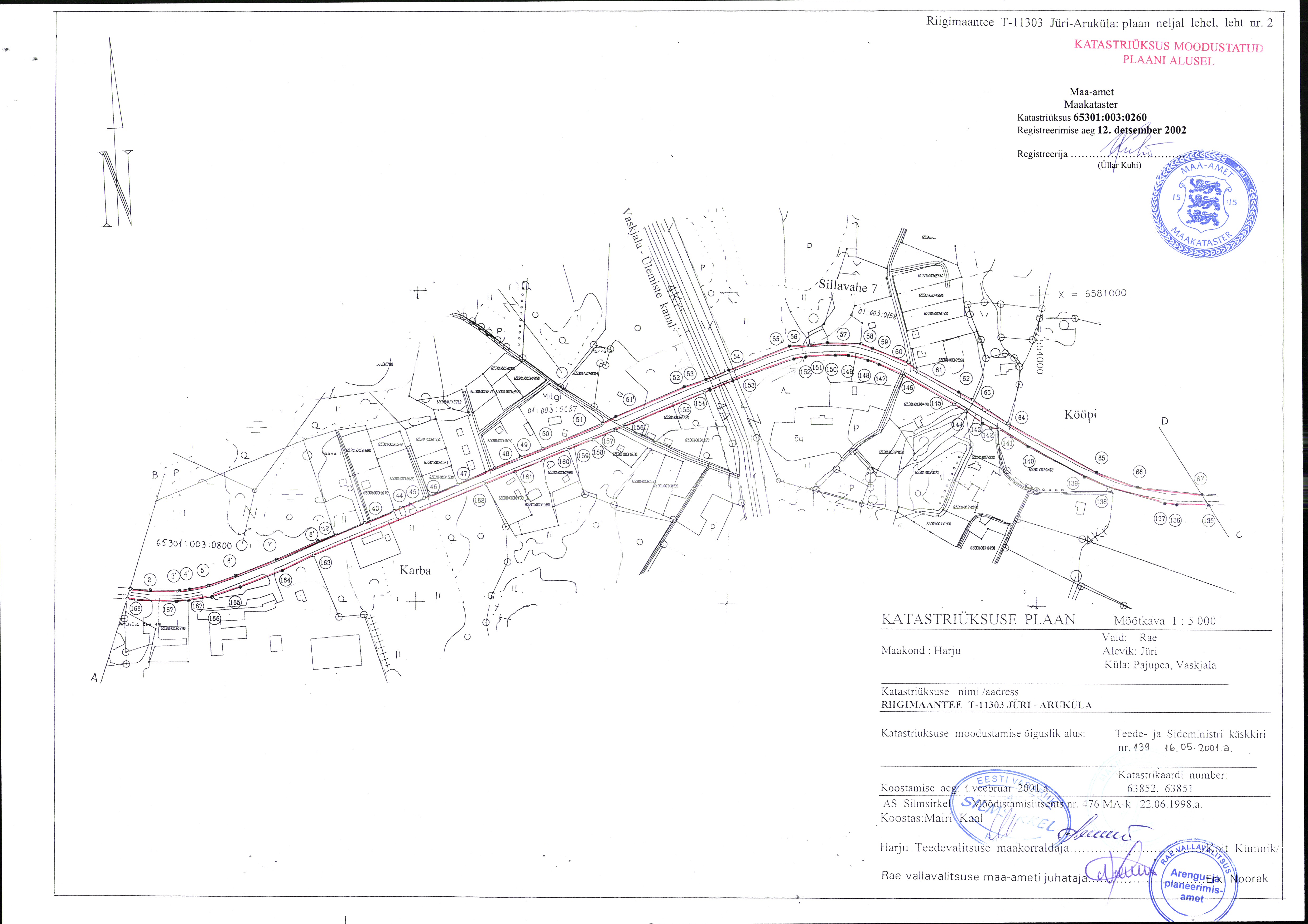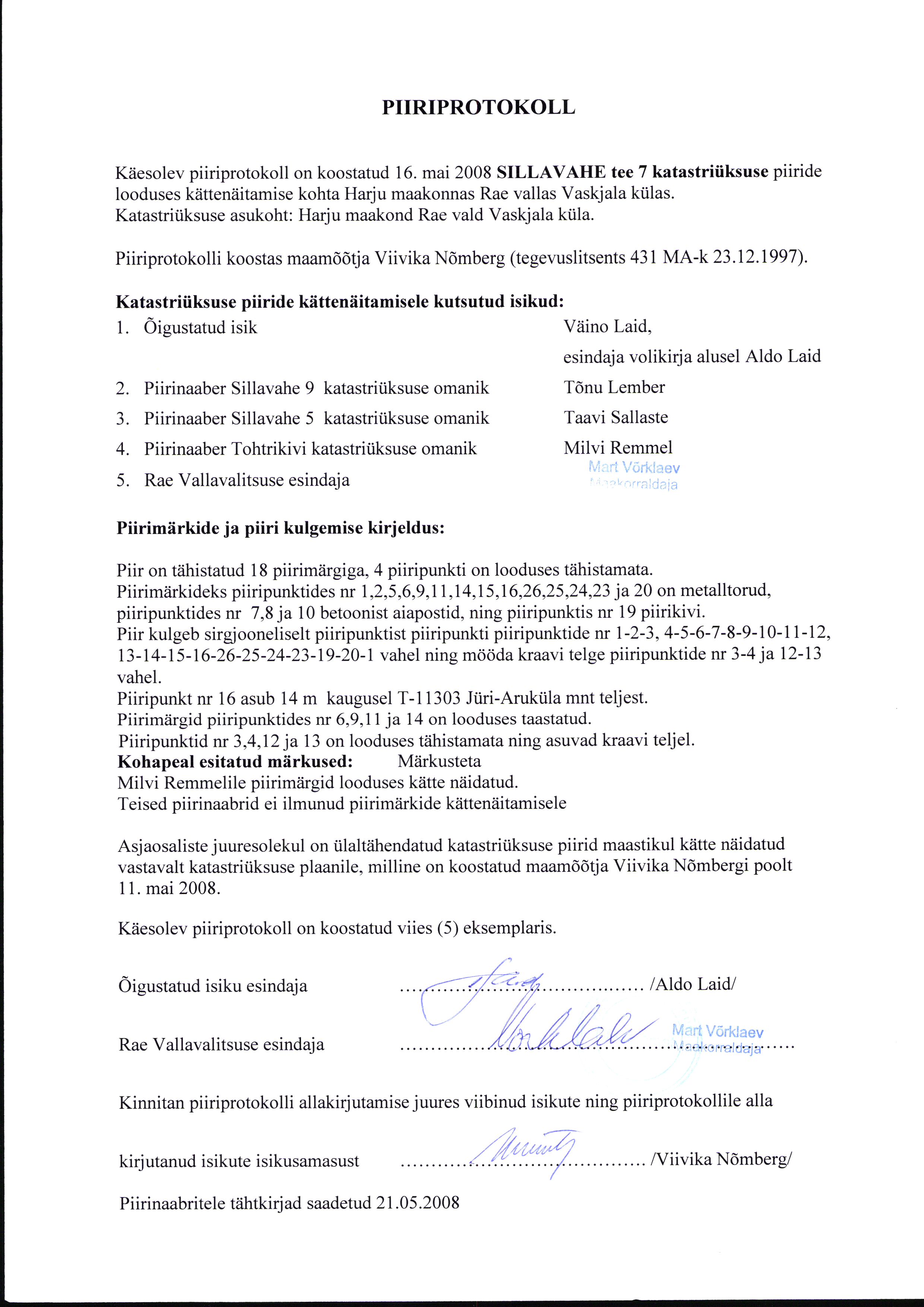 Transpordiamet 11303 Jüri-Aruküla tee (65301:003:0260) katastriüksuse omaniku esindaja Piiri asukoha maastikul kättenäitamise põhjus Teatan Harju maakonnas Rae vallas Vaskjala külas asuva Eesti Vabariigile kuuluva nimetatud katastriüksusega piirneva Sillavahe tee 7 (65301:003:1007) katastriüksuse jagamisest ja mõõdistamisest. Ühisel mõõdistatud piiril on 1 ühine piiripunkt nr 10, vt Lisa 1. Piiripunktis on piirimärgiks olemasolev piirinael. Piiripunkt nr 10 on endise Sillavahe tee 7 katastriüksuse piiriprotokollis kirjeldatud 14 m kaugusele tee teljest, kuid pärast tee rekonstrueerimist on tee asukoht nihkunud ja piiripunkt asub 16 m kaugusel tee teljest. Maamõõtja ettepanek: piiripunkti nr 10 kaugust tee teljest mitte kirjeldada. Aeg ja koht Piiri ja piirimärkide kättenäitamine toimub nimetatud katastriüksustel looduses. Kutsun Teid piiri ja piirimärkide kättenäitamisele reedel 17.10.2025 kell 9.15. Kohtumispaigaks on piiripunkt nr 10, vt Lisa 1. Ilmumata jätmise või kirjaliku seisukoha esitamata jätmise tagajärjed Oma osalemisest või mitteosalemisest palun teavitage mind sellest kirja lõpus oleva e-maili või telefoni teel. Samadel kontaktidel saate esitada ka täiendavaid küsimusi. Piiri kättenäitamisele võite saata ka esindaja. Palun mind sellest eelnevalt teavitada ja esitada mulle esindust tõendav volikiri. Kutse saatmisega loetakse piirimärkide asukohad ja nende alalhoiu kohustus kinnisasja omanikule teatavaks tehtuks ja omanik piiride asukohaga nõustunuks (maakatastriseaduse § 17 lõige 6), välja arvatud juhul, kui ilmneb piiride kindlakstegemise vajadus. Kui Teil on piiri ja piirimärkide kohta märkusi, tuleb need esitada hiljemalt piiri kättenäitamisel maastikul. Teie poolt esitatud märkused, taotlused ja seisukohad kantakse piiriprotokolli. Palun kindlasti mind teavitada, kas osalete või mitte, ilma eelneva teavitamiseta piiri ja piirmärkide kättenäitamist ei toimu ning loen piirid ja piirimärgid kätte näidatuks ilma märkusteta. Piiriprotokolli allkirjastamine Pärast piiri kättenäitamist koostatakse 3 tööpäeva jooksul piiriprotokoll, mida saate allkirjastada digitaalselt. Digitaalse allkirjastamise võimaluse puudumisel teavitage mind eelnevalt ning sellisel juhul saate piiriprotokolli allkirjastada käsitsi paberil. Piirimärkide alalhoiukohustus Kinnisasja omanik peab tagama piirimärgistuse säilimise. Te ei või piirimärke iseseisvalt muuta ega ümber paigutada (asjaõigusseaduse § 128 lg 2).