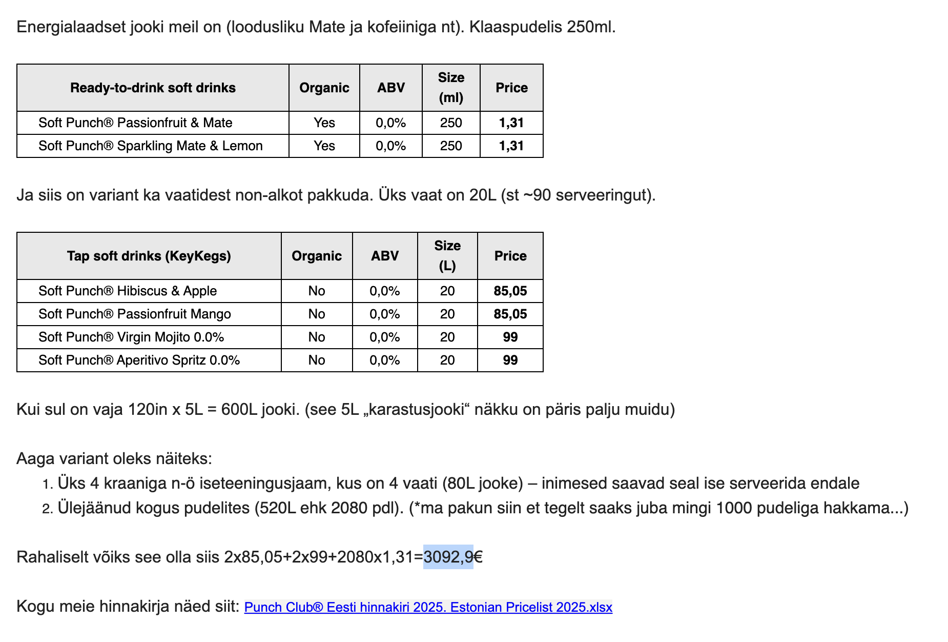 After the event and on the occasion when extra costs have been agreed upon during the event (e.g. extra beverages, extra service hours etc), the representative of Jahh Catering OÜ will issue the final and corrected Quote within 3 (three) working days after the event in a written form. Recalculation does not include opened bottles of beverages. The Customer has an obligation to return the rented inventory fully.