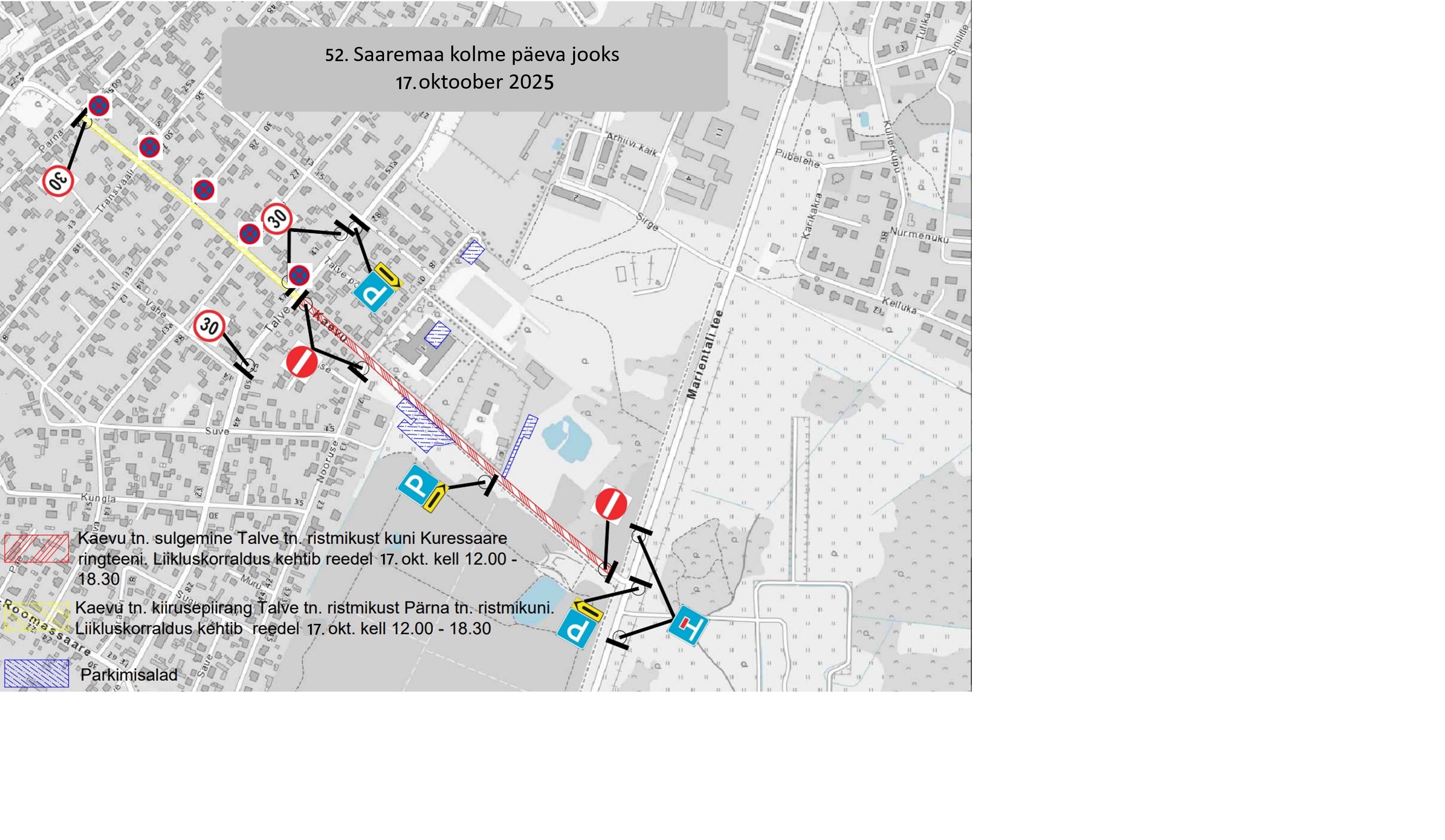 52. SAAREMAA KOLME PÄEVA JOOKS LIIKLUSKORRALDUSE SKEEM 17. oktoober 2025, kell 15.00-18.00