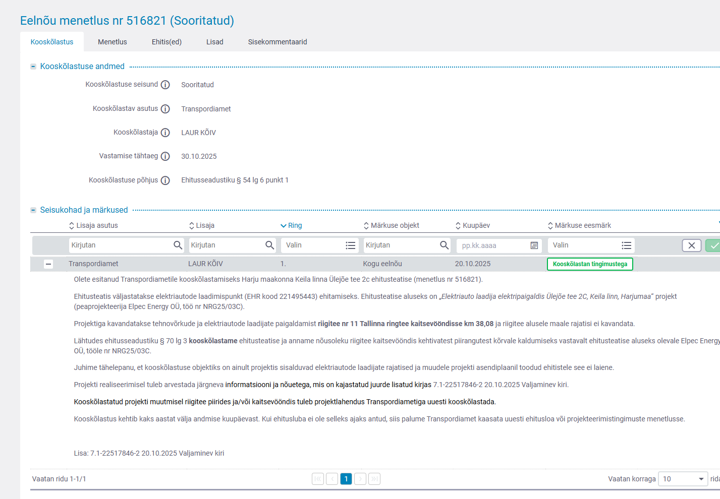 Juhime tähelepanu, et kooskõlastuse objektiks on ainult projektis sisalduvad elektriautode laadijate