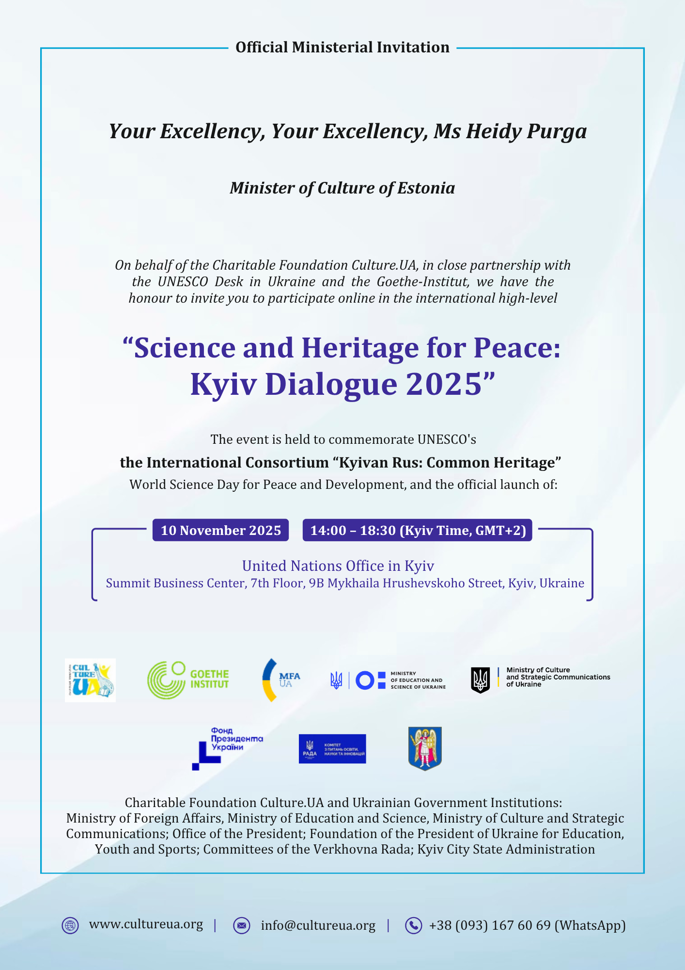 On behalf of the Charitable Foundation “Culture.UA” (Ukraine), and in close partnership with the UNESCO Office in Ukraine and the Goethe-Institut, I have the honour to convey the attached official invitation to your Minister to participate online in the upcoming international high-level forum “Science and Heritage for Peace: Kyiv Dialogue 2025”, to be held on 10 November 2025 at the United Nations Office in Kyiv, within the framework of UNESCO’s World Science Day for Peace and Development.