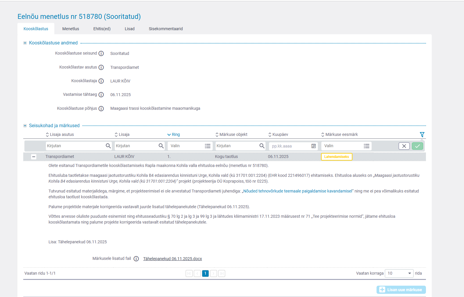 Palume materjale korrigeerida ning esitada uuesti kooskõlastamiseks.