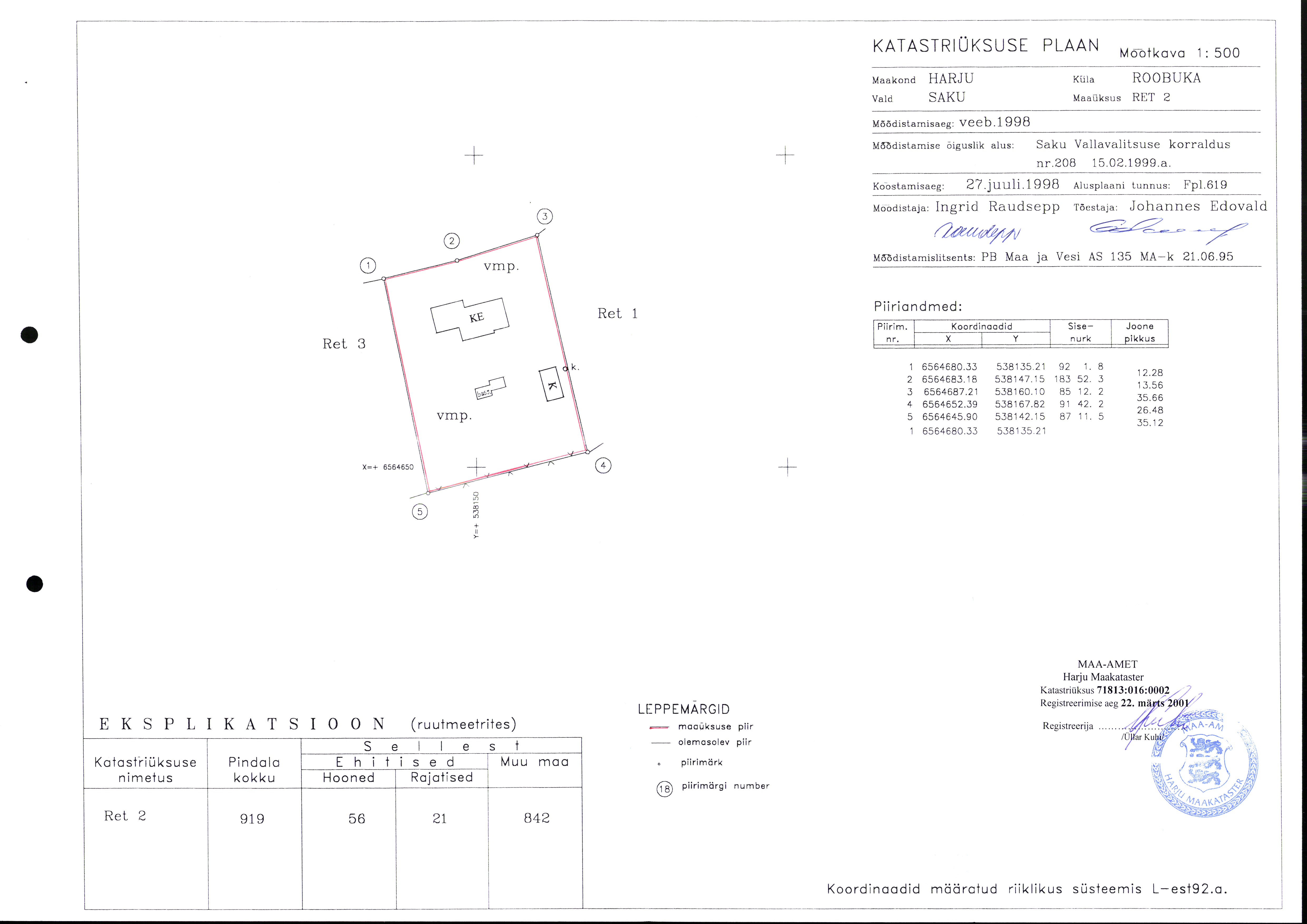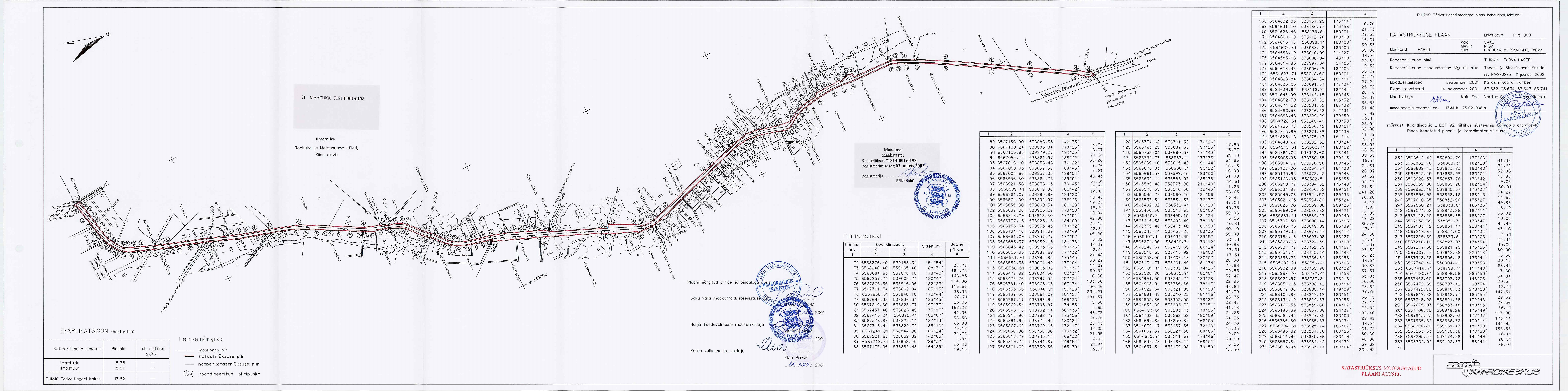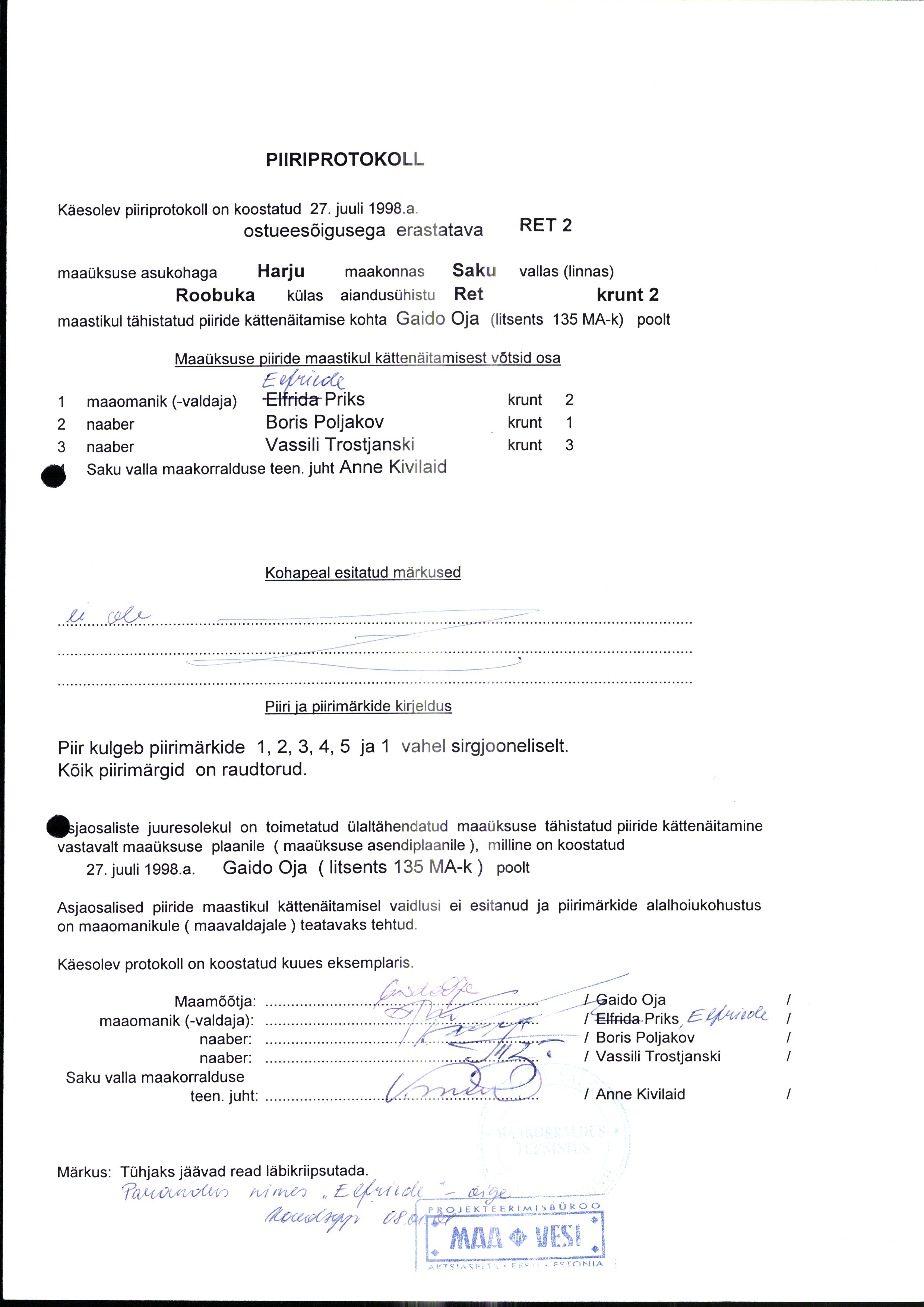 Transpordiamet 11240 Tõdva-Hageri tee (71814:001:0198) katastriüksuse omaniku esindaja Piiri kindlakstegemise põhjus Teatan Harju maakonnas Saku vallas Roobuka külas asuva Eesti Vabariigile kuuluva nimetatud katastriüksusega piirneva Pihlamarja tee 12 (71813:016:0002) katastriüksuse piiride mõõdistamisest. Ühisel mõõdistatud piiril on 2 ühist piiripunkti nr 4 ja 3, vt Lisa 1. Tööde käigus selgus, et Piiripunktides nr 1,2,3,4 ja 5 olevate aiapostide asukohad looduses ei vasta katastriüksuste piiripunktide koordinaatidele, erinevused on üle lubatud vea (0.20 m) piiri, vt Lisa 2. Need asjaolud nõuavad piiri kindlakstegemist. Piiri kindlakstegemisel määratakse piiri asukoht koostöös puudutatud kinnisasjade omanikega ja vajaduse korral kohaliku omavalitsuse üksuse esindajaga.