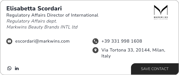 SERBIA NEPAL MACEDONIA PORTUGAL BOSNIA-HERZEGOVINA ROMANIA BANGLADESH IRELAND ALBANIA KUWAIT ESTONIA MONTENEGRO AZERBAIJAN GEORGIA MYANMAR INDIA PAKISTAN SLOVENIA MOROCCO ICELAND VIETNAM Notification will be provided to the appropriate regulatory authorities in the relevant markets. All communications should be addressed to the following contact person: Name: Elisabetta Scordari Qualification: Regulatory Affairs Director of International E-mail address: [email protected] Sincerely. Markwins Beauty Brands INTL Ltd