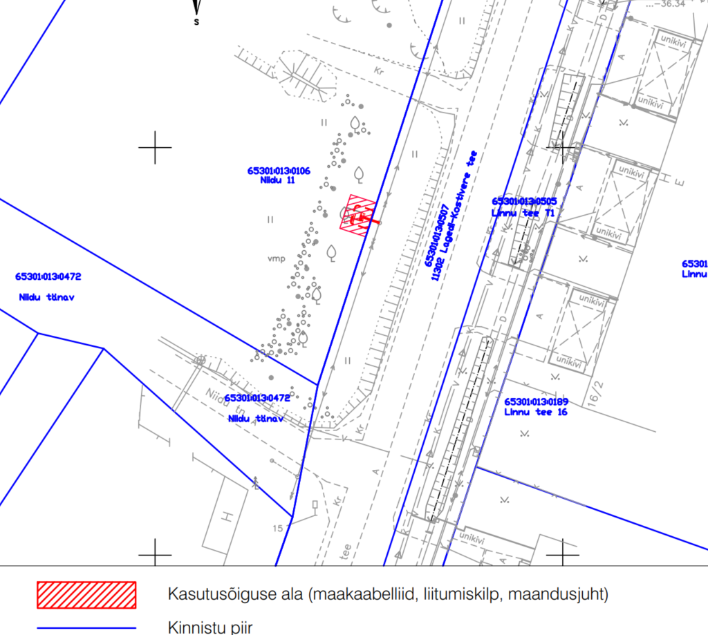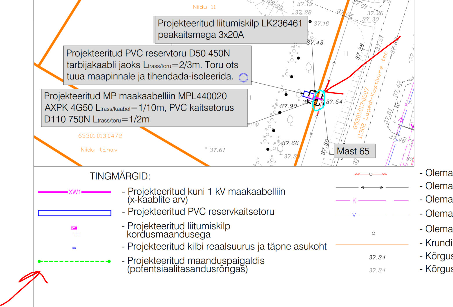 potentsiaalitasandusrõngas ca 30 cm sügavusel ja 1 m raadiusega kilbist. 8. Plaanil kujutatud tingmärgid viitavad objekti asukohale, kuid mitte tegelikule suurusele looduses. 9. Liitumiskilbis on projekteeritud tarbijakaabli(-te) jaoks ühendusklemmid vastavalt Elektrilevi OÜ