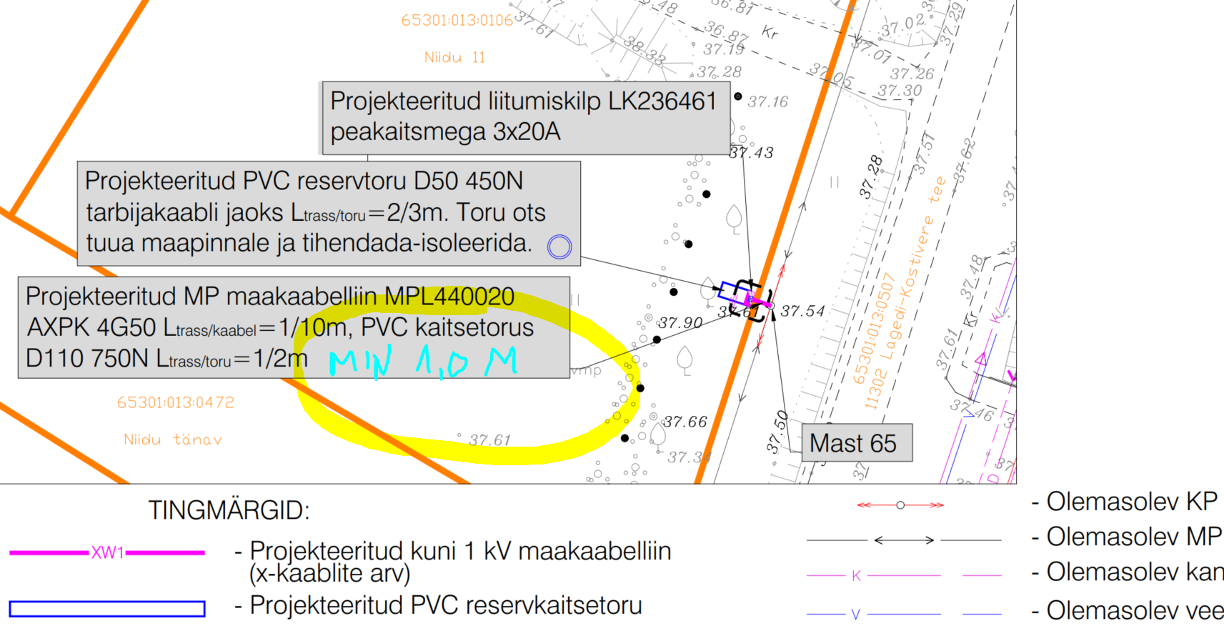 Projekteeritud MP maakaabelliin MPL440020 AXPK 4G50 Ltrass/kaabel=25/37m, PVC kaitsetorus D110 TRAM maaüksusel 750N Ltrass/toru=23/25m, kaabli rajamise min. sügavus 1m, Niidu tänaval 450N Ltrass/toru=2/4m kaabli rajamise min. sügavus 0,7m.