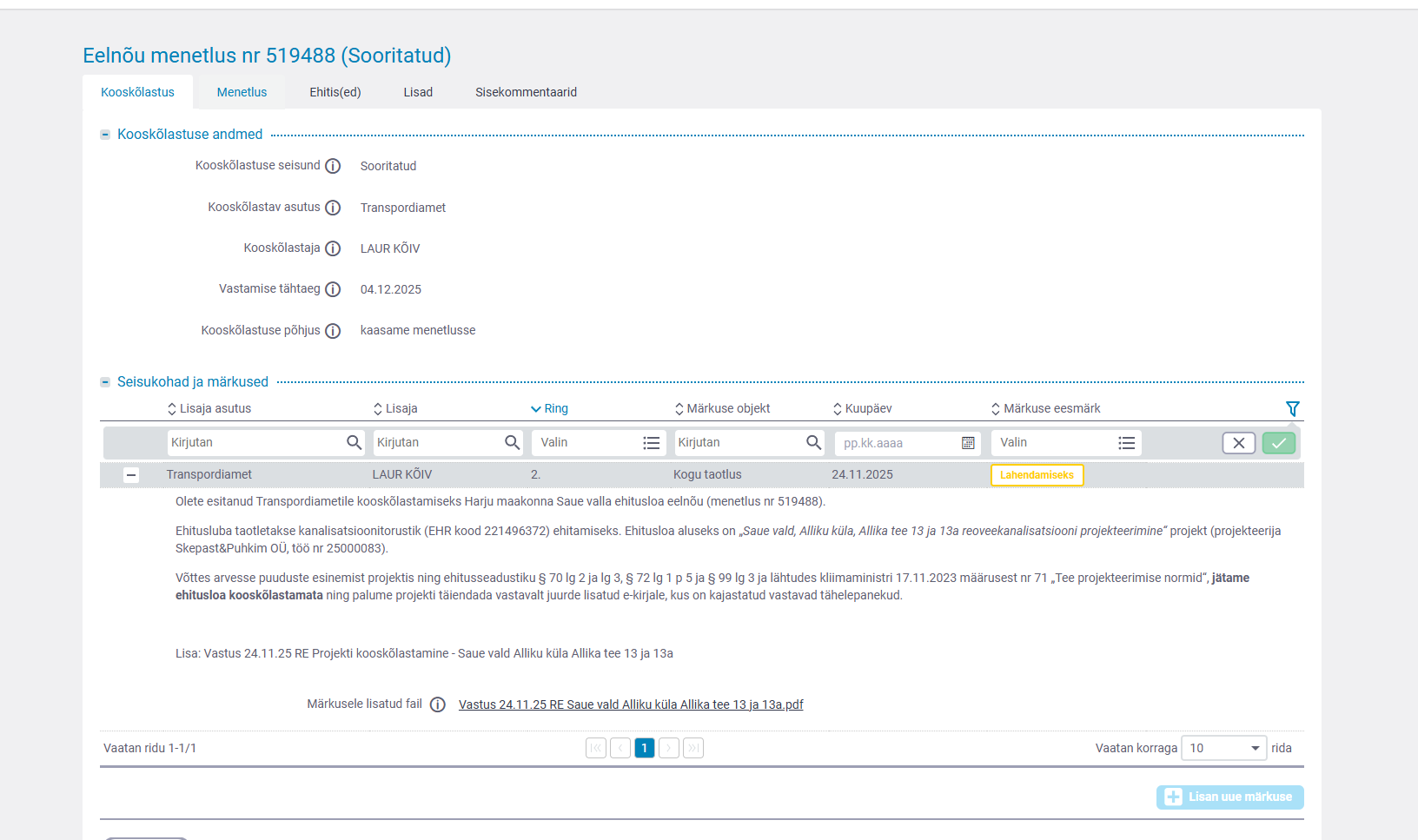 From: Laur Kõiv Sent: Monday, November 24, 2025 2:27 PM To: 'Loit Munter' <[email protected]>; 'Caroli Kruus' <[email protected]> Subject: RE: Projekti kooskõlastamine - Saue vald, Alliku küla, Allika tee 13 ja 13a Tere Oleme esitatud materjalid üle vaadanud ning edastame tähelepanekud, mille osas palume materjale korrigeerida/täiendada. Lisaks saame aru, et antud asjus on ehitusloa menetlus EHR andmebaasis. Palume kaasata ka Transpordiamet kooskõlastajana EHR ehitusloa menetlusse.