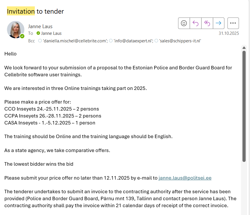 Hello We look forward to your submission of a proposal to the Estonian Police and Border Guard Board for Cellebrite software user trainings. We are interested in three Online trainings taking part on 2025. Please make a price o er for: CCO Inseyets 24.-25.11.2025 – 2 persons CCPA Inseyets 26.-28.11.2025 – 2 persons CASA Inseyets - 1.-5.12.2025 – 1 person The training should be Online and the training language should be English. As a state agency, we take comparative o ers. The lowest bidder wins the bid Please submit your price o er no later than 12.11.2025 by e-mail to [email protected] The tenderer undertakes to submit an invoice to the contracting authority after the service has been provided (Police and Border Guard Board, Pärnu mnt 139, Tallinn and contact person Janne Laus). The contracting authority shall pay the invoice within 21 calendar days of receipt of the correct invoice. Kind regards Janne Laus Training Specialist Training and development department Police and Border Guard Board [email protected] +372 5477 0597