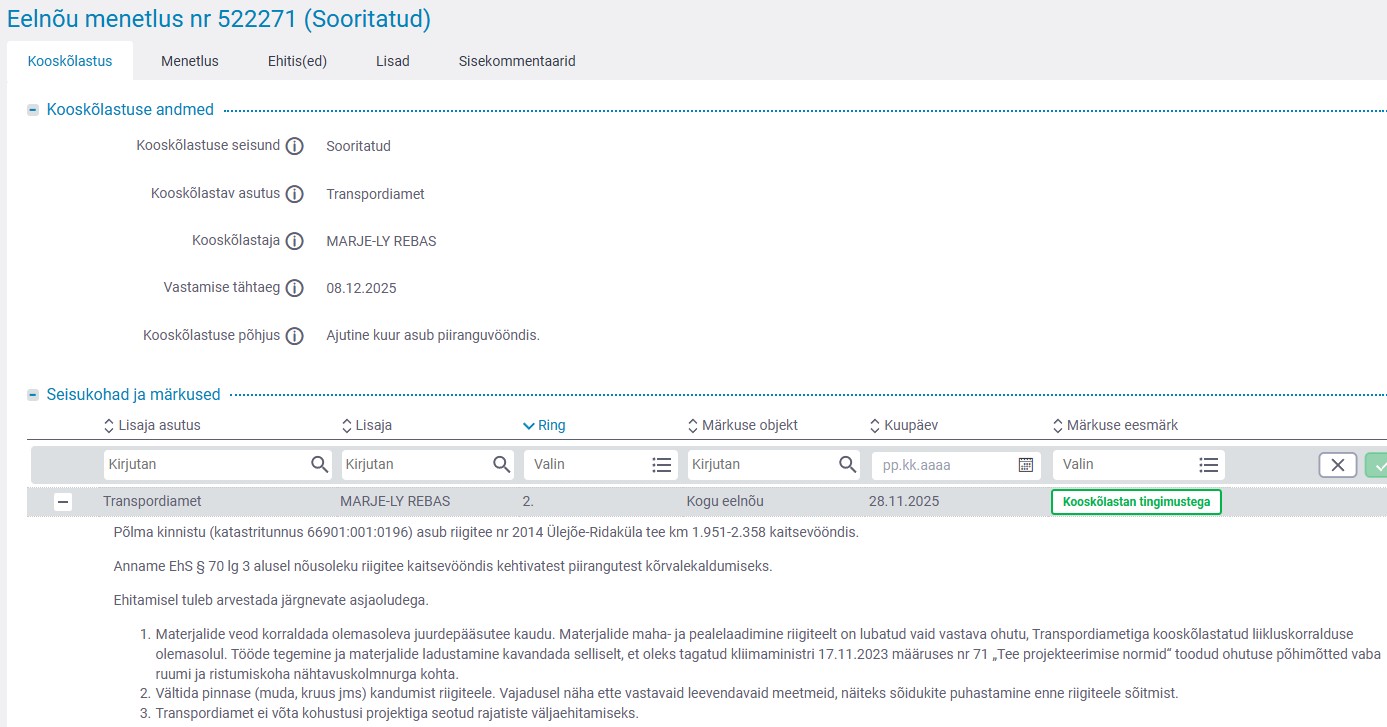 | Vastutaja | Marje-Ly Rebas (Users, Teehoiuteenistus, Planeerimise osakond, Kooskõlastuste üksus) |