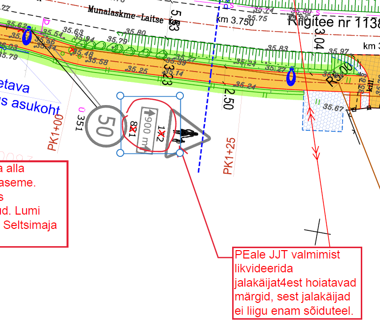 3. Hoiatusmärgid jalakäijatest näha projektiga ette likvideeritavatena. Peale JJT valmimist ei liigu enam jalakäijad sõiduteel.