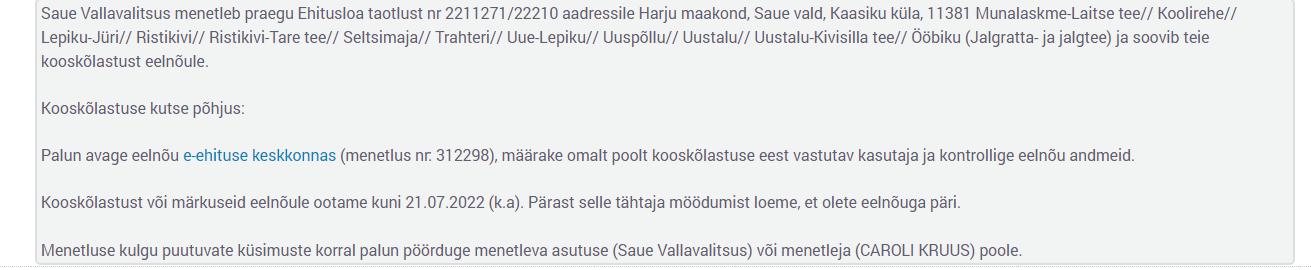 | Vastutaja | Krista Einama (Transpordiamet, Users, Taristu haldamise teenistus, Projekteerimise osakond, Taristu kooskõlastuste üksus) |