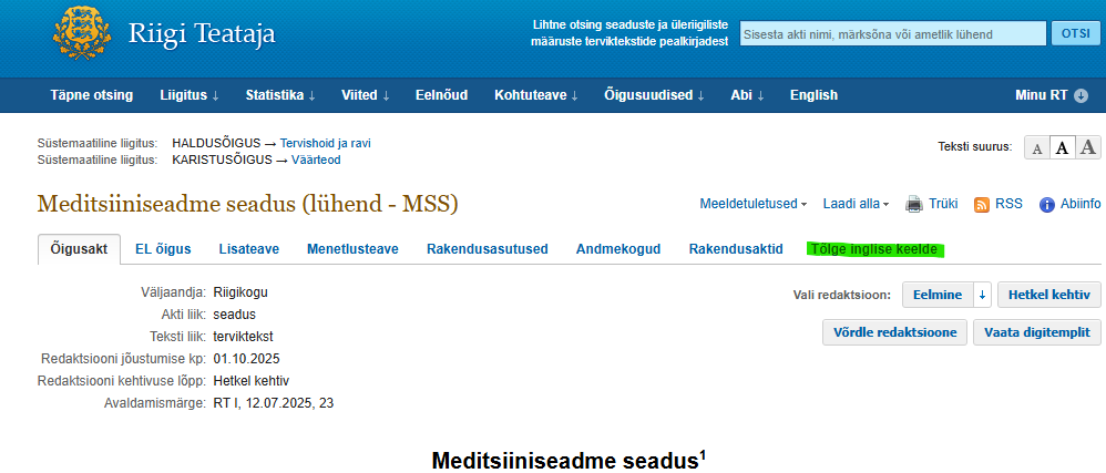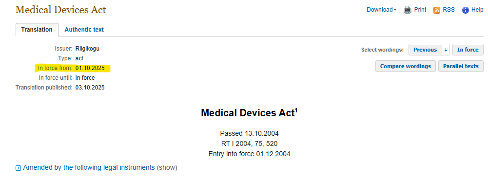 Any regulatory updates can be found at any given moment in Riigi Teataja and specifically when looking at the Estonian Medical Devices Act, you are able to select the version In force as well as move to any previous versions.
