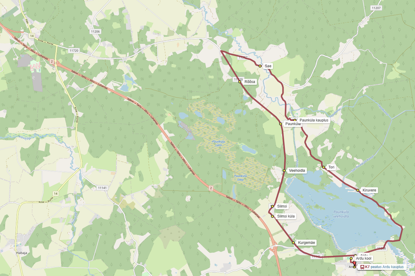 Selle info põhjal võiks olla nii, et peatus Kose-Risti 3 on Kose alevikust eemalduv suund ja Kose-Risti 4 on siis Kose aleviku poole minev suund. Kui võtta 2024.a andmed, siis Kose-Risti 3 peatust kasutas kõikide liinide peale kokku 350 sisenejat ja Kose-Risti 4 peatust 902 sisenejat. 2025.a esimese 10 kuu võrdluses on reisijate arv mõnevõrra väiksem kui 2024.a esimese 10 kuu lõikes. Samas on minu tabelist arusaamatu, et kuidas saab mõlemat peatust kasutada liin nr K7, mis kaardi järgi sõidab ainult Ardu kandis ja ümber Paunküla veehoidla (vt väljavõte all) ja selle järgi liin K7 üldse Kose-Risti peatustest läbi justkui ei sõidagi.