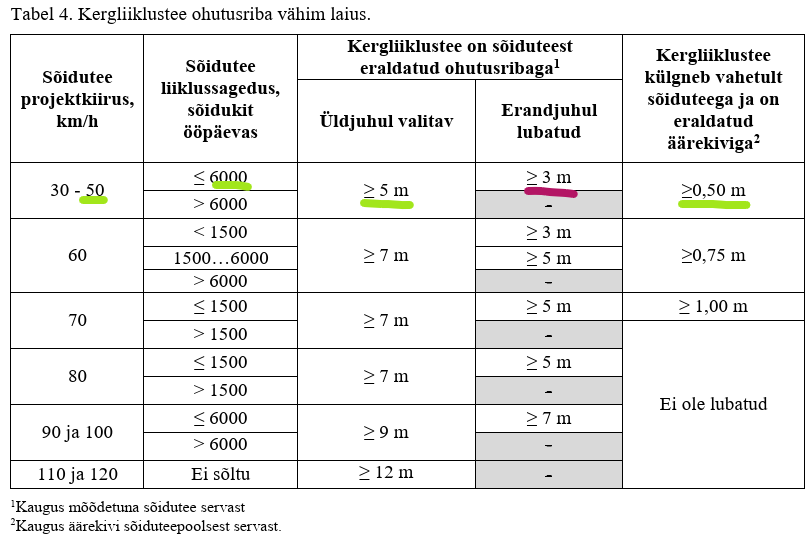 Kavandatav kergliiklustee kulgeb paralleelselt sõiduteega (riigitee nr 14 Kose-Purila tee), siis tuleb tagada „Kergliiklustaristu kavandamise juhend“ tabelis 4 sätestatud kergliiklustee ja sõidutee omavahelise ohutusriba vähimad laiused. Kitsamat ohutusriba on erandjuhul lubatud kasutada ainult tabelis esitatud liiklussageduste korral.