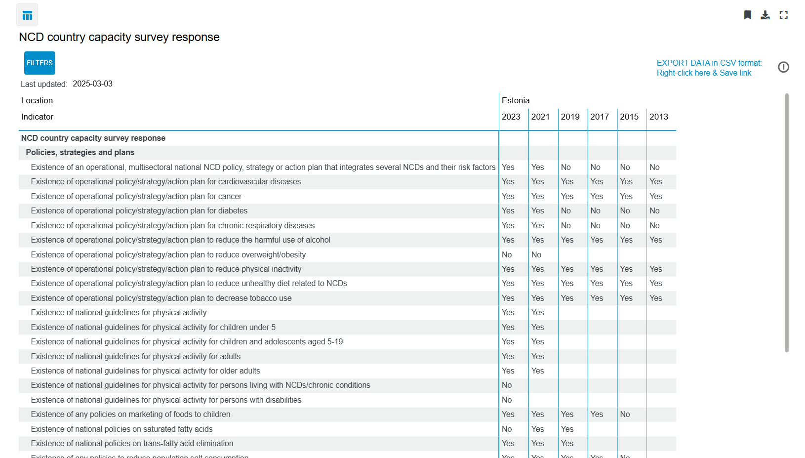 ja aegrida ei katke. Alates 2026. aastast on see mõõdik tervist toetavate valikute programmist 2026-2029 tegevuspõhise riigieelarve mõõdikutest välja arvatud samal põhjusel, et seda aegrida enam WHO-s ei uuendata.
