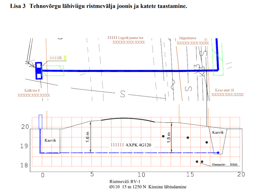 - Juhime tähelepanu, et diagonaalis kaabli ristumine riigiteega ei ole Transpordiameti poolt aktsepteeritav. Kõik maa-aluste tehnovõrkude ristumised riigiteedega tuleb kavandada võimalikult täisnurga all (70°-110°).