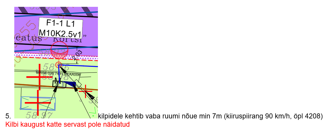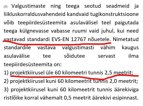 mast min 2m riigitee katte servast ja min 2m truubist (masti paigaldamine kraavi on välistatud), kaabel kõikjal min 1250N kaitsetorus ja min 1,5m sügavusel (sh truubi all peab olema tagatud sügavus min 1m truubi põhjast kaitsetoru peale)