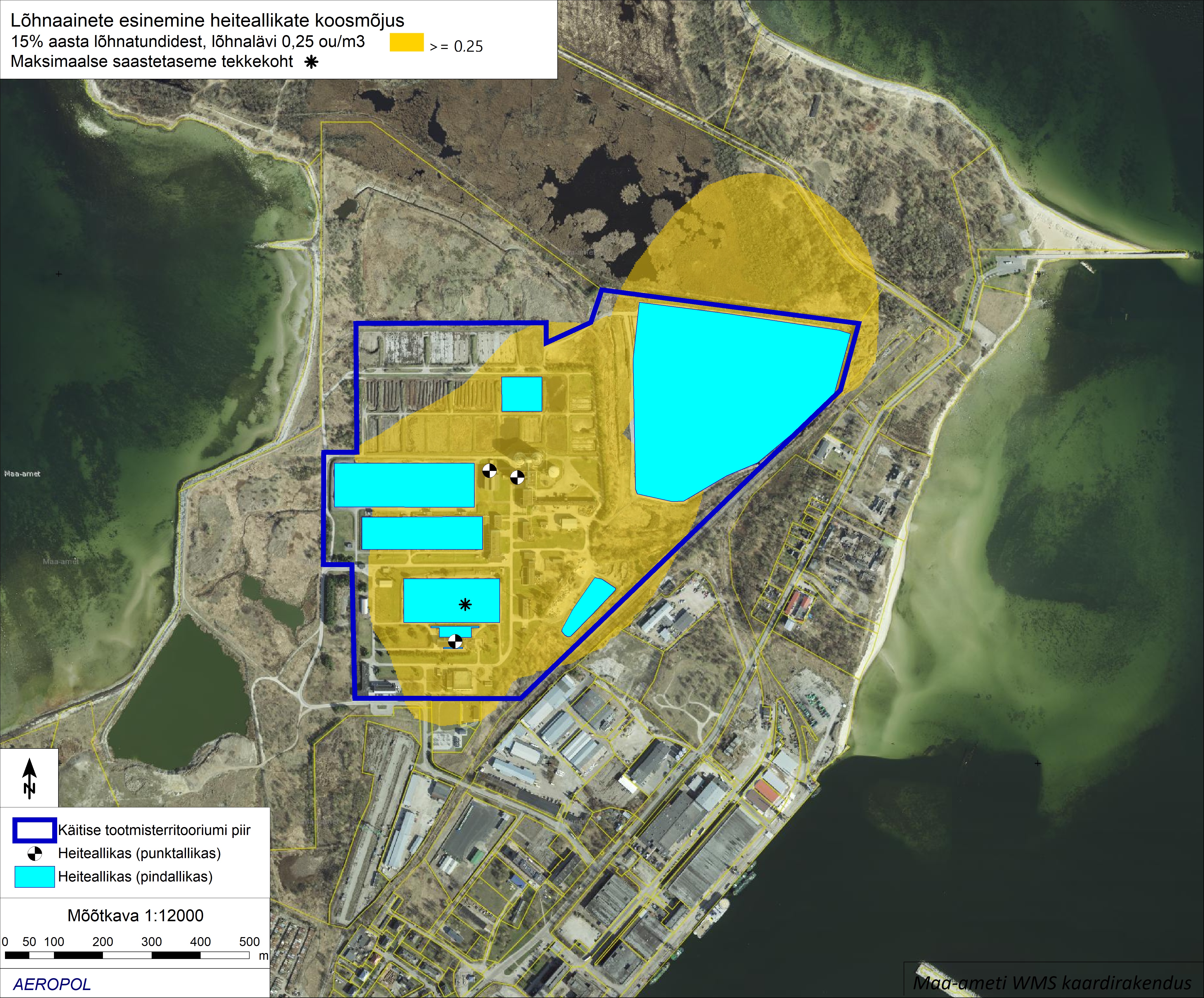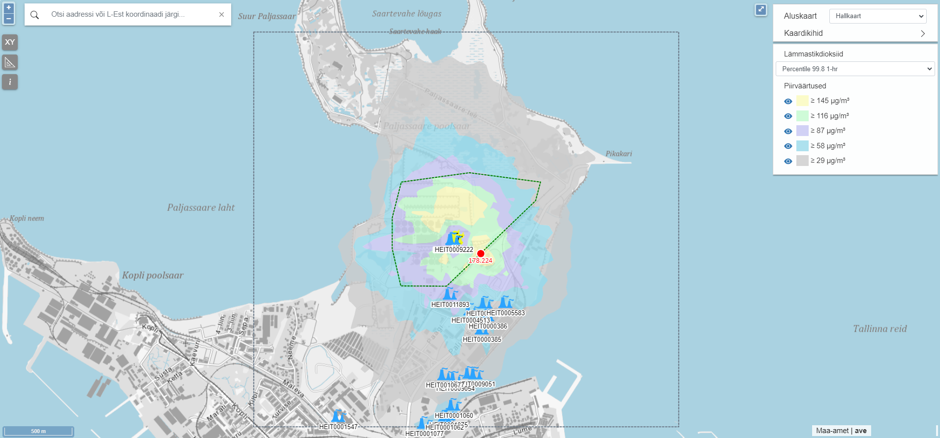 Aktsiaselts Tallinna Vesi kompleksloa nr KKL-509326 taotlus. PM10 koosmõju 1 a keskmine hajumiskaart (väljavõte KOTKAS süsteemi kaardirakenduest). Tallinna Vesi tootmisterritoorium on kaardil tähistatud roheline punktiirjoonega. Kaardil on eraldi tehtud väljavõte alalt, kus esineb saasteaine maksimaalne kontsentratsioon väljaspool Tallinna Vesi territooriumi (viimane on väljavõttel tähistatud punase punktiga, mille juures on esitatud vastav väärtus).