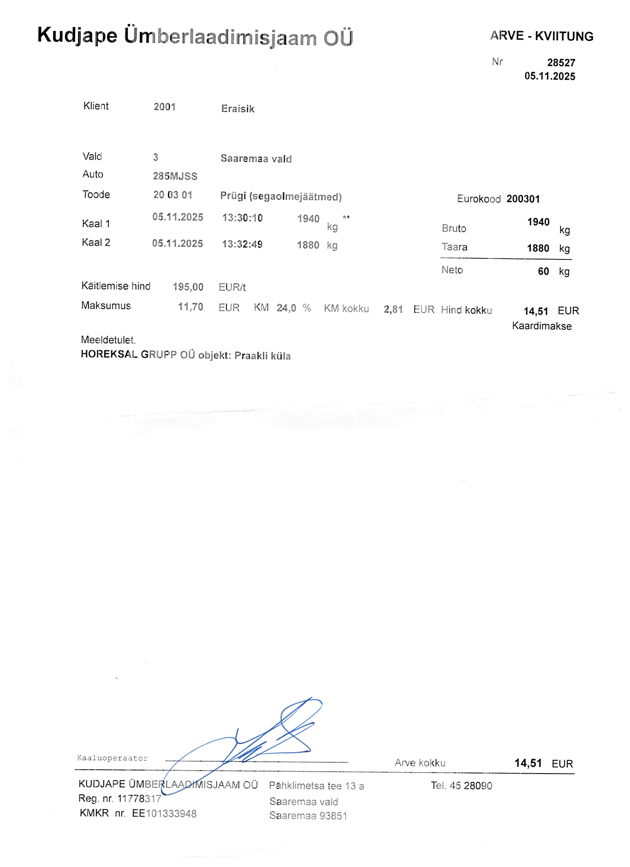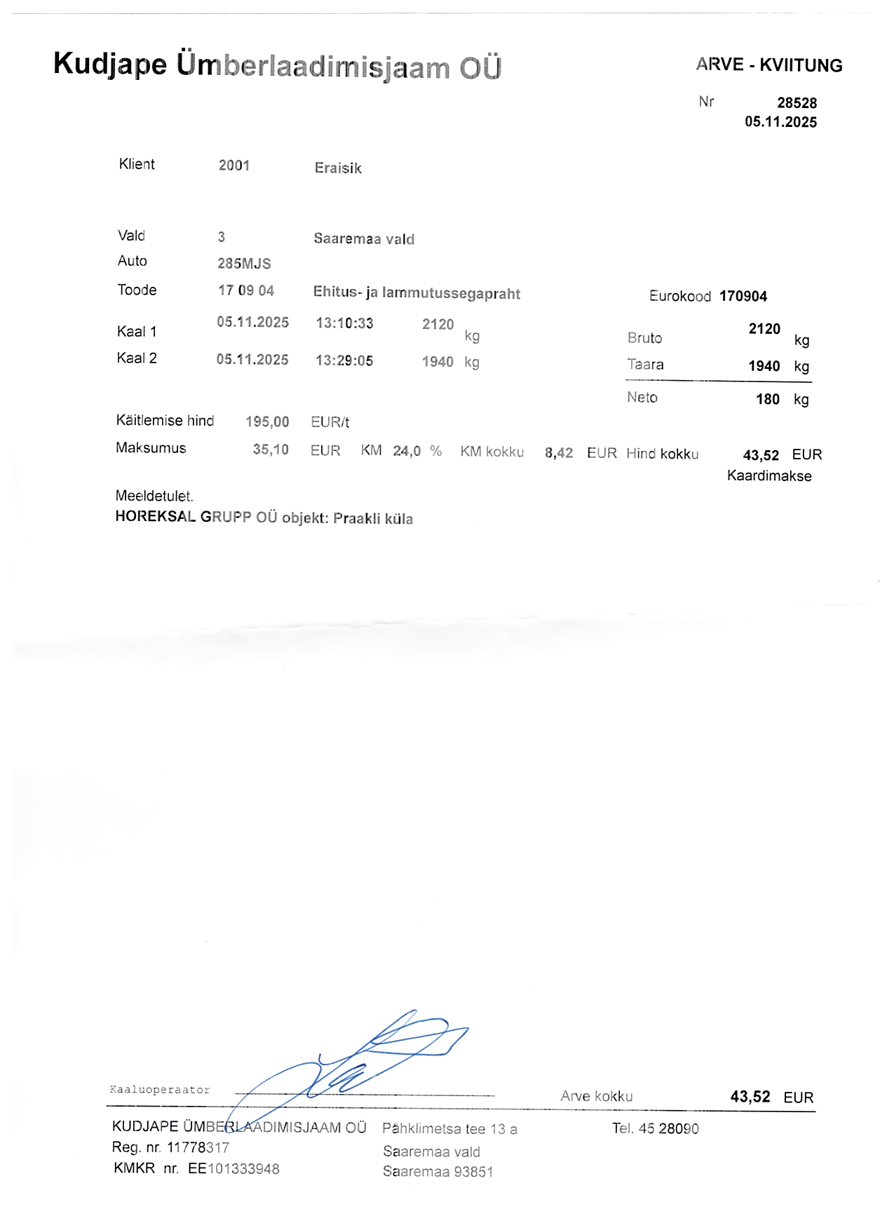 | Saabumis/saatmisviis | Horeksal Grupp OÜ |