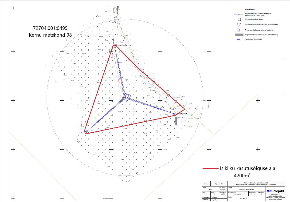 Tere Elisa Eesti AS soovib sõlmida RMK-ga isikliku kasutusõiguse lepingu mobiilside masti rajamiseks Kernu metskond 98 kinnistule (katastritunnus 72704:001:0495) ja sõiduteeservituudi lepingu Kernu metskond 27 kinnistule (katastritunnus 72704:001:0180). Isikliku kasutusõiguse sisu: 80m mobiilside masti, seadmekonteineri, piirdeaedade, juurdesõidutee, toite- ja sidekaablite rajamine, ekspluateerimine ja hooldamine. Elisa poolt allkirjastab lepingu volituse alusel Janno Viskus. Lugupidamisega Margus Hergauk Sideobjektide ehituse ettevalmistuse spetsialist +372 5657 0777 www.elisa.ee