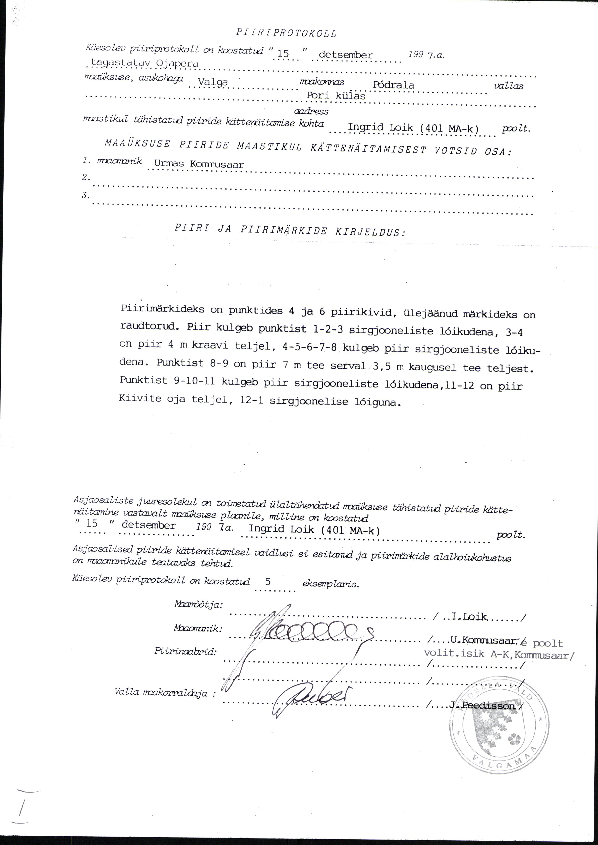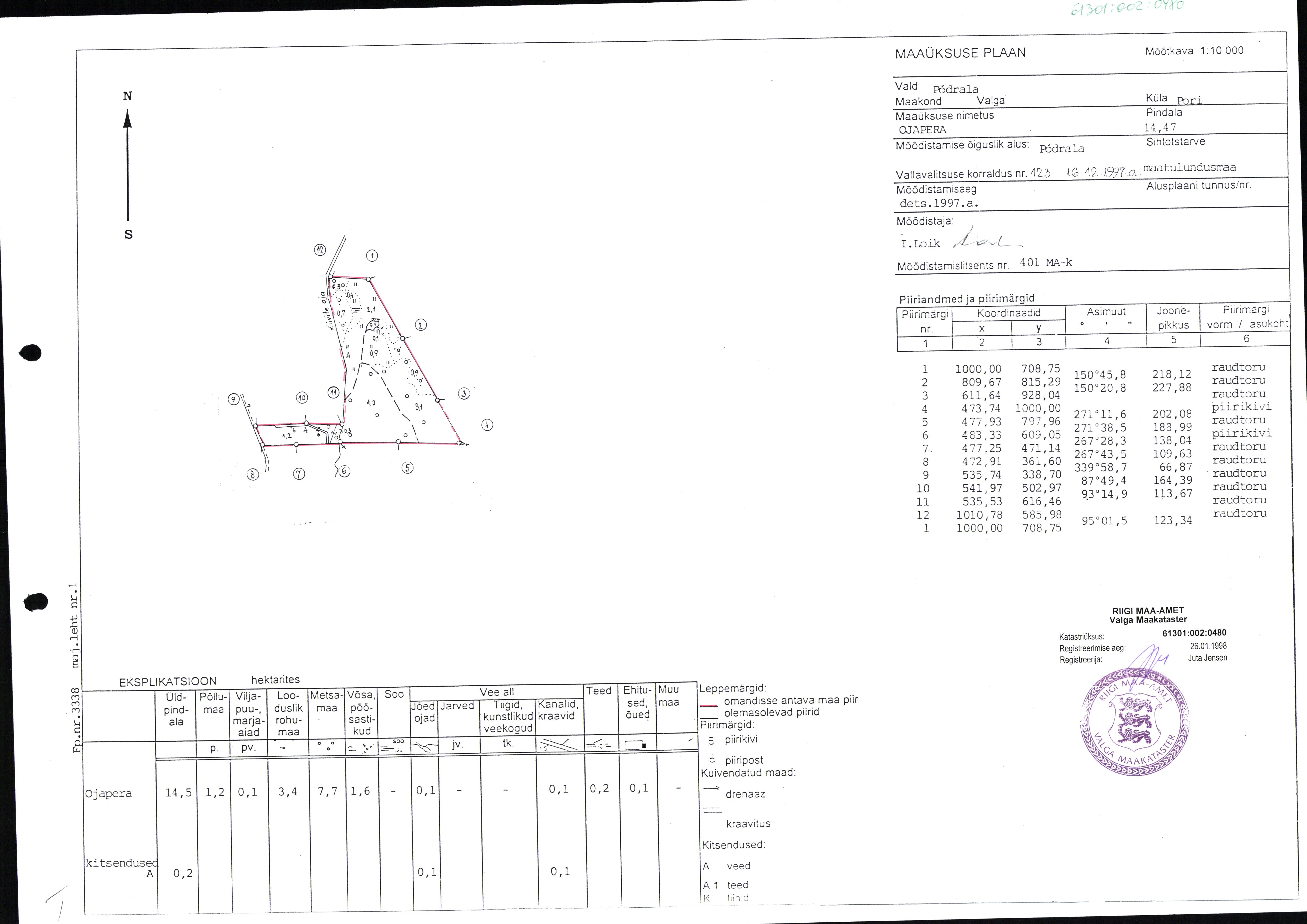 Tere Tiit! Lemeks Metsamaad OÜ-le kuulub Ojapera 61301:002:1290 kinnistu Pori külas Tõrva vallas. Kinnistu punktide 3 ja 4 vahel on piiriks kraavi telg, kuid tegelikult on vana kraav läinud edasi, kuid seda ei ole hooldatud. Lisan siia piiriprotokolli ja plaani. Me sooviksime taastada, hooldada, Teie PA110 er.20,22, 23, 33 ja meie kinnistu vahelist vana kraavi. Käisin ja vaatasin looduses üle ja minu hinnangul saab kraavi teha nii, et Teie poolt üle 8 cm puid ei pea raiuma ja sette paneme enda poole. Me selleks kuskilt luba ega teatist võtma ei pea, kuna tegemist ei ole kuivendussüteemi REK-ga vaid pigem hooldusega. Lisatud plaanil kraavi hooldamine tähistatud punase joonega. Töödega plaanime alustada kas oktoobri lõpp või novembri algus. Jään teie seisukohta ootama. Tervitades Ülo Vendland metsakasvataja