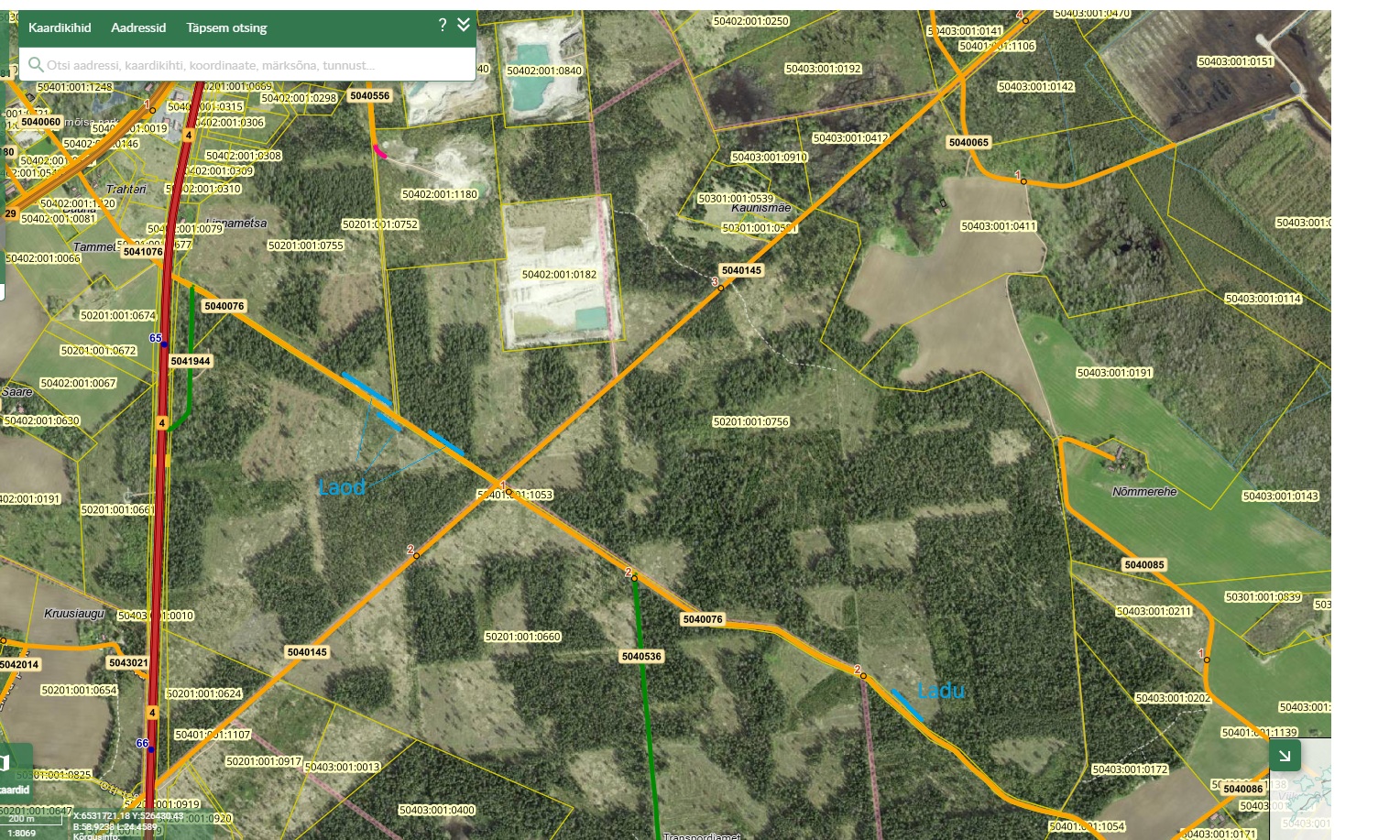 2. Vaheladude asukohad: Metsamaterjali veoks kasutatava tee ja vaheladude asukohad on näidatud