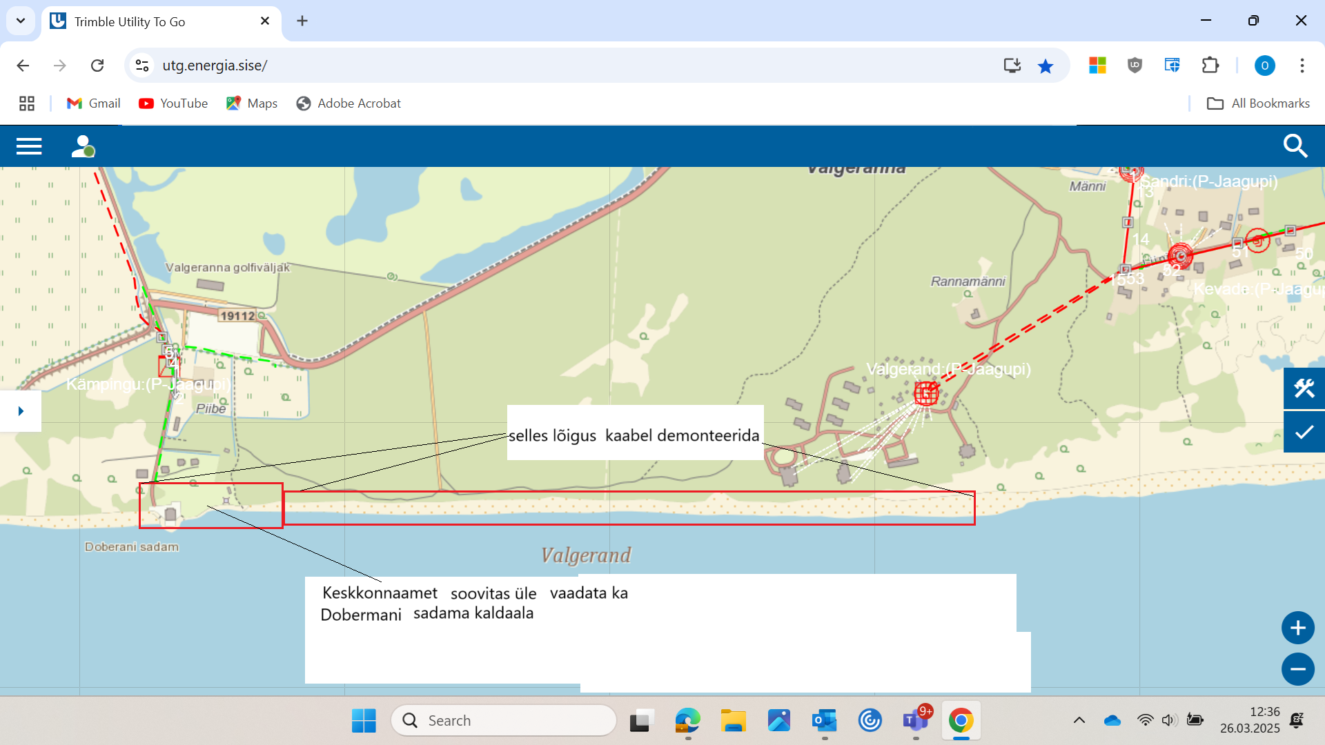 Tere Elektrilevi tellin sellise töö meie käest. Koristada ära Valgerannas mere ääres olev vana maha jäetud kõrgepinge kaabel. Töid planeerime teostada 11.04.2025 Mere ääres liigume väikse ekskavaatoriga, et saada käe võimalikut palju seda kaablit, kaevamis kohad silume pärast ära. Mere äärde sõidame enne parklat mere äärde viiva tee pealt. Panen ka juurde joonised kus on näidatud meie töö maa.