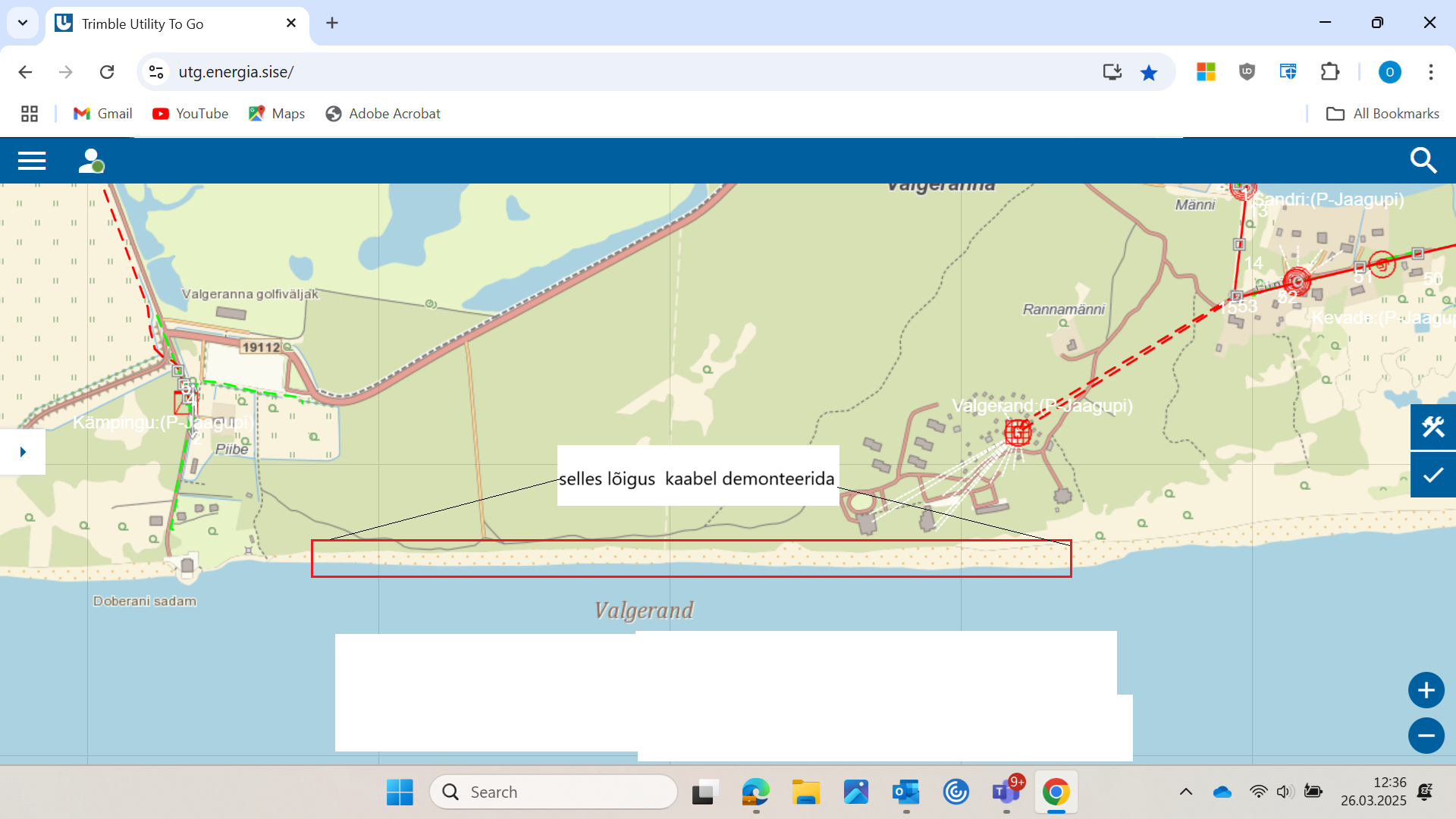Tere Elektrilevi tellin sellise töö meie käest. Koristada ära Valgerannas mere ääres olev vana maha jäetud kõrgepinge kaabel. Töid planeerime teostada 11.04.2025 Mere ääres liigume väikse ekskavaatoriga, et saada käe võimalikut palju seda kaablit, kaevamis kohad silume pärast ära. Mere äärde sõidame enne parklat mere äärde viiva tee pealt. Panen ka juurde joonised kus on näidatud meie töö maa.